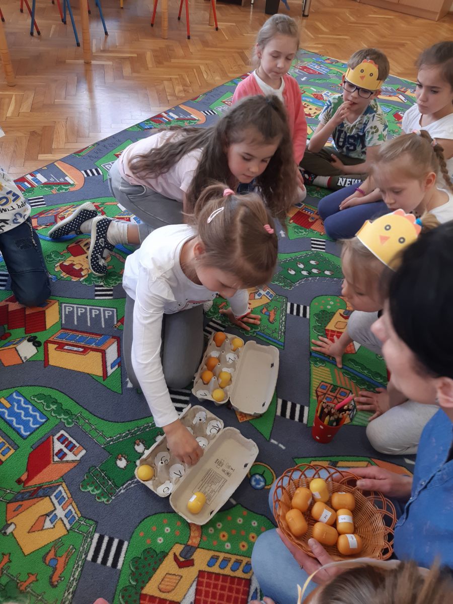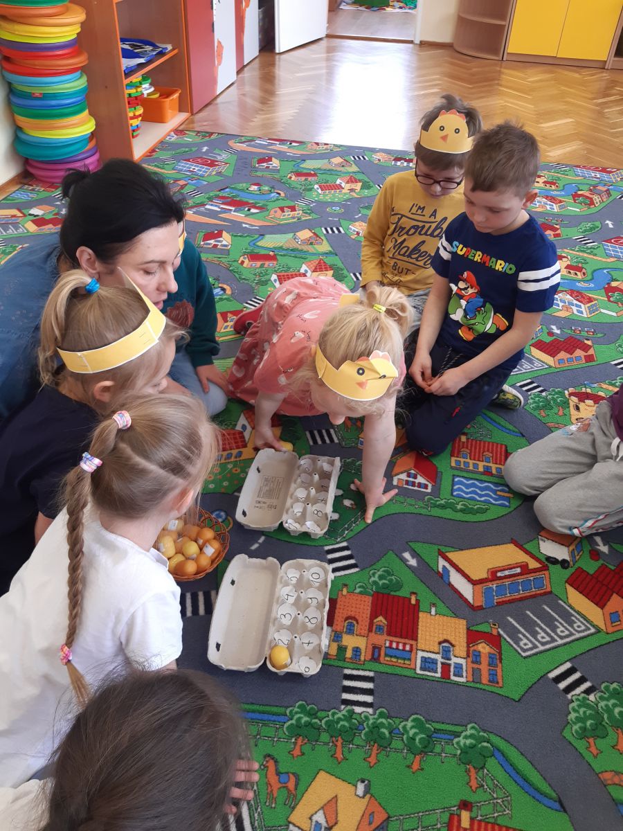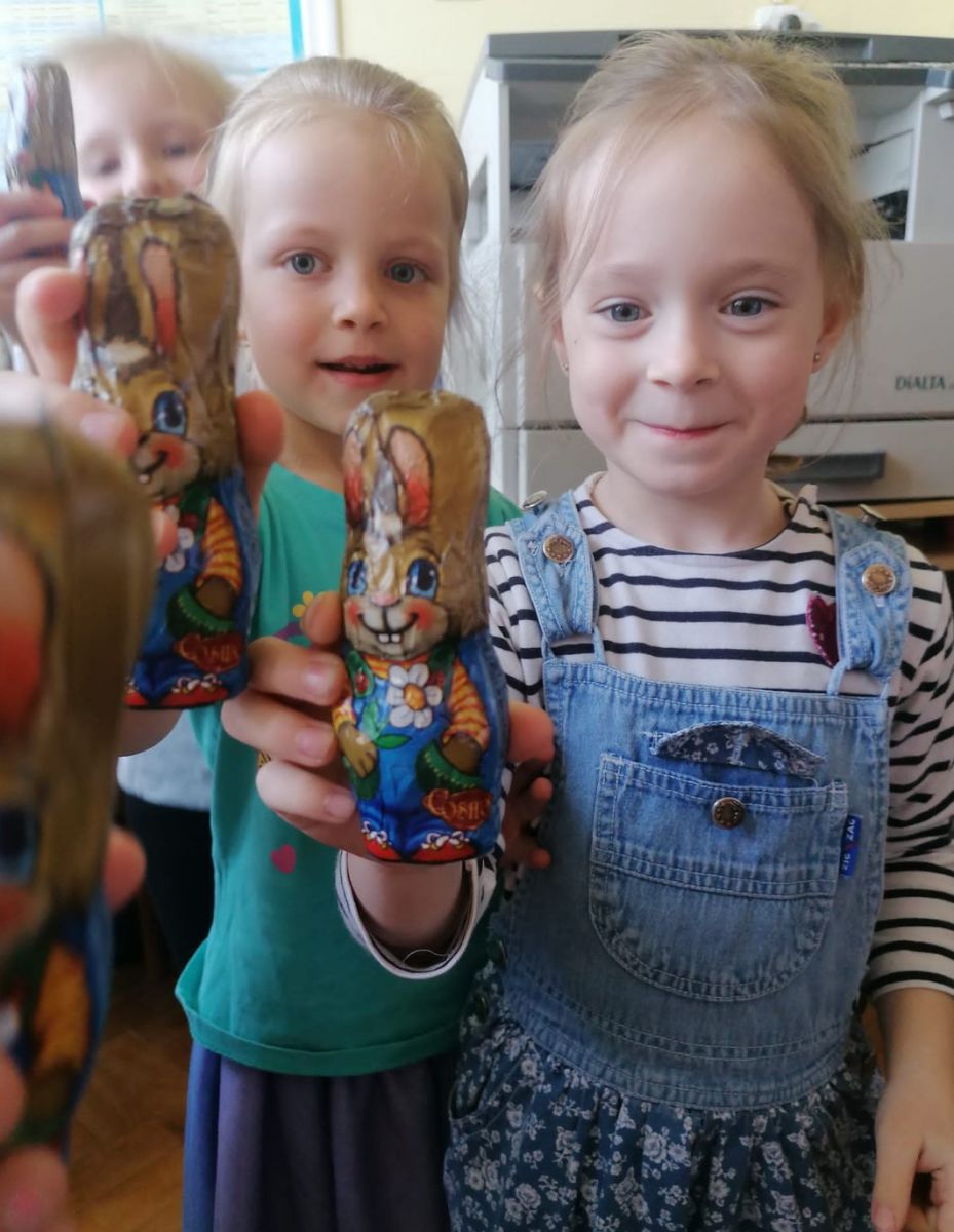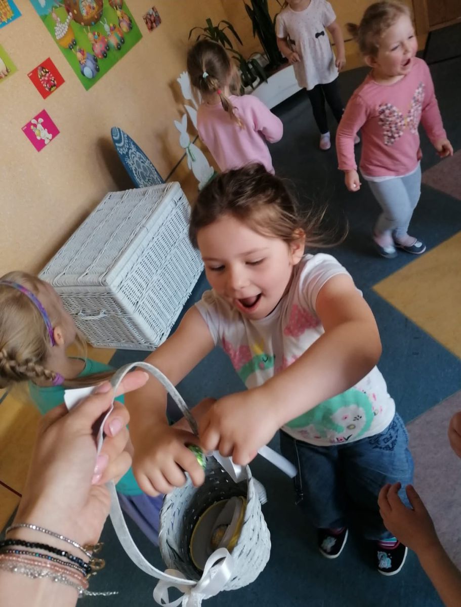 Pierwszym zadaniem dzieci był wysiew owsa i rzeżuchy, których zieleń symbolizuje budzące się życie. Każda grupa przygotowywała ciekawe ozdoby, które wymagały dużego zaangażowania i cierpliwości przy ich wykonaniu. Sale i korytarze naszego przedszkola wypełniły się pięknymi ozdobami świątecznymi. Nie zabrakło różnorodnych pisanek i kartek świątecznych oraz prac tematycznie związanych ze świętami. Aktywny udział dzieci w przygotowaniach pozwala bliżej poznać tradycje związane z Wielkanocą i wprowadza je w świąteczny nastrój oczekiwania. Dzieci poznawały i wymieniały tradycje jakie są co roku w ich domach: święcenie koszyczka z pokarmami, pieczenie bab wielkanocnych oraz polewanie się wodą w śmigus dyngus. W grupie „Wesołych Nutek” przedszkolaki ,idąc śladami czekoladowych jajeczek poszukiwały zajączka. Było dużo radości i niespodzianek.Niech te Święta Wielkiej Nocy będą czasem radośnie spędzonych wspólnie z dziećmi chwil!