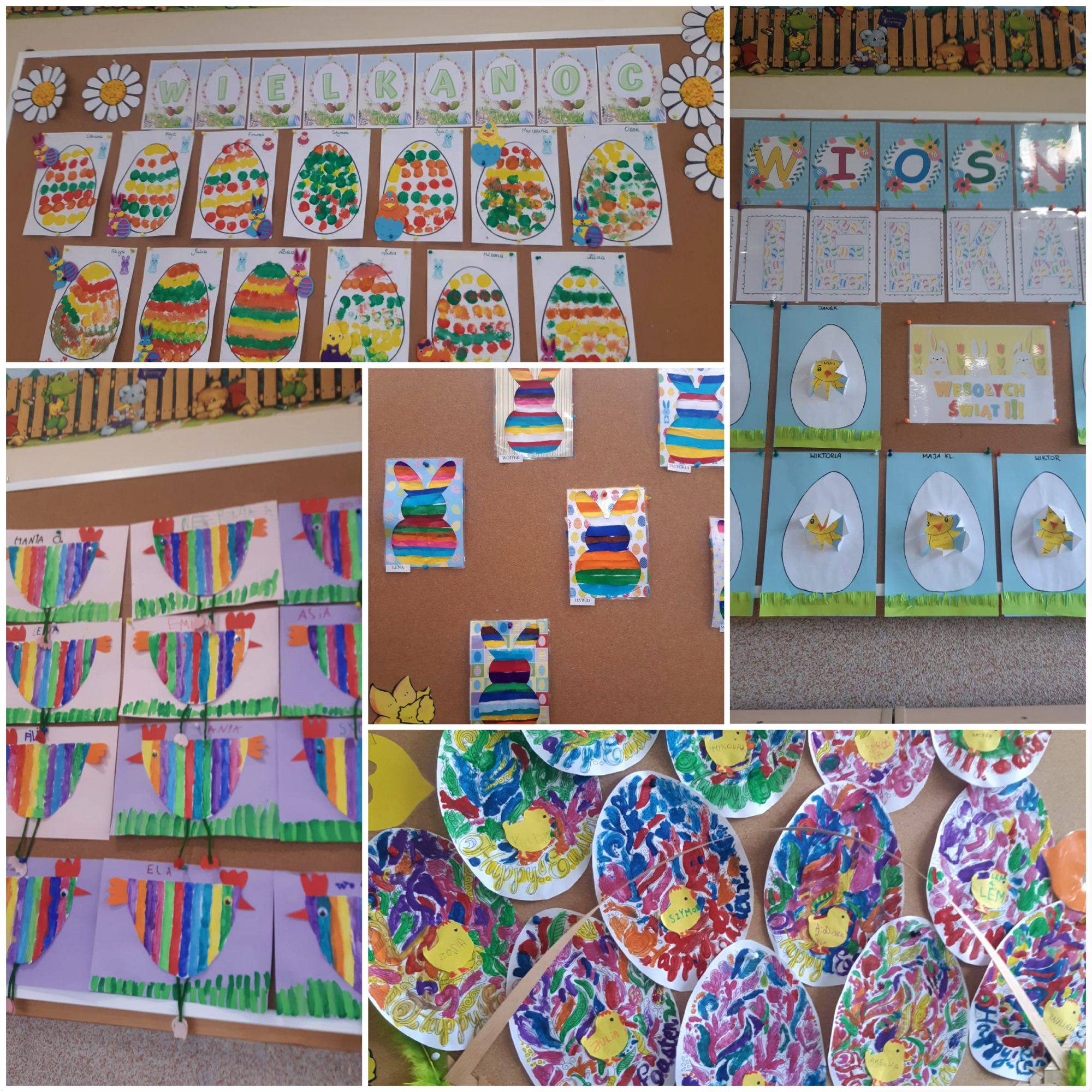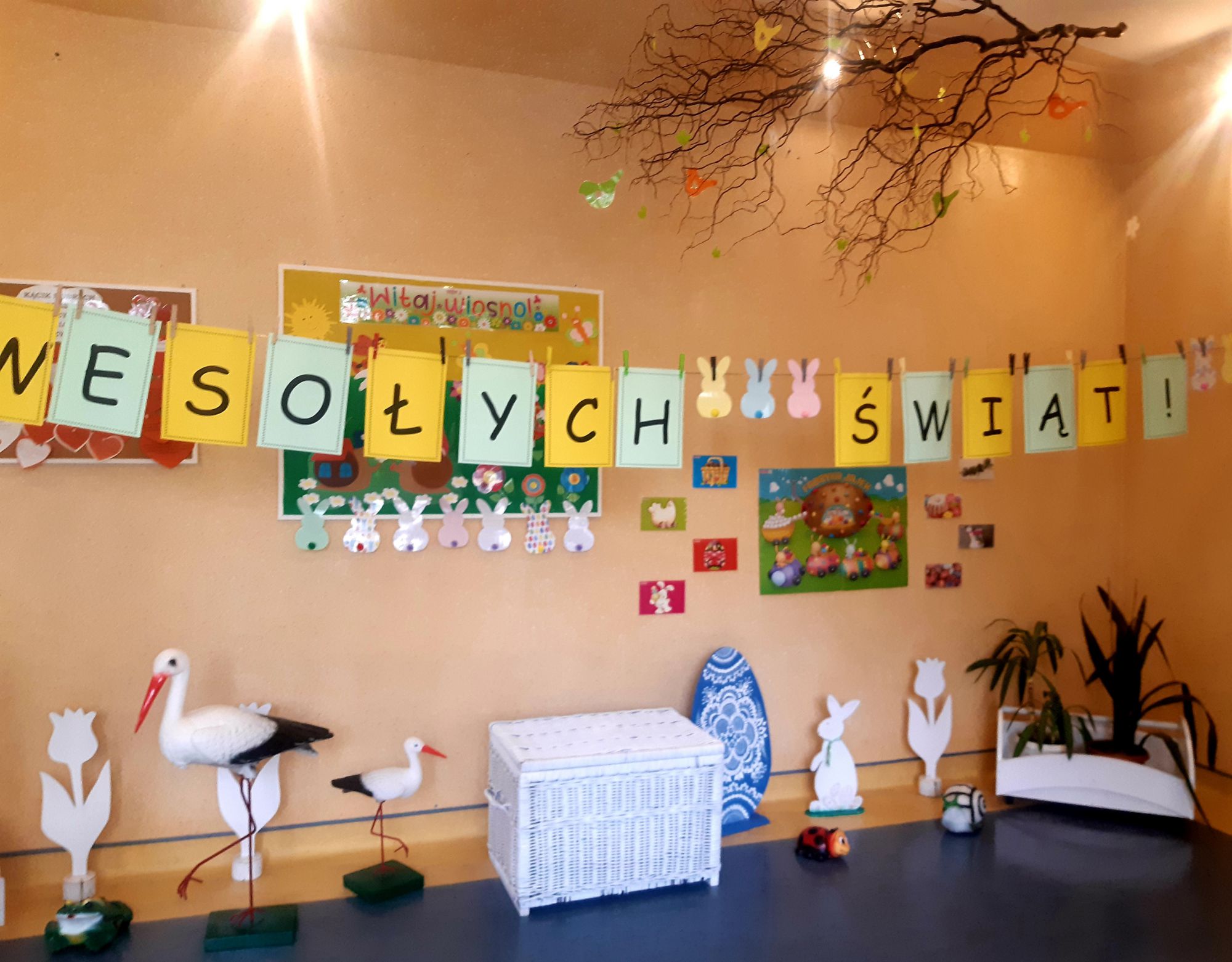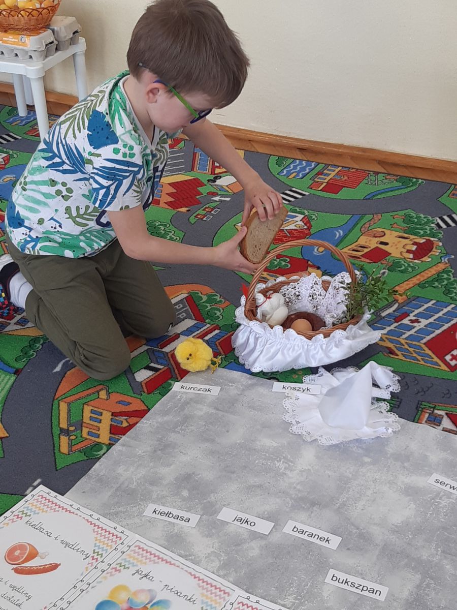 Pierwszym zadaniem dzieci był wysiew owsa i rzeżuchy, których zieleń symbolizuje budzące się życie. Każda grupa przygotowywała ciekawe ozdoby, które wymagały dużego zaangażowania i cierpliwości przy ich wykonaniu. Sale i korytarze naszego przedszkola wypełniły się pięknymi ozdobami świątecznymi. Nie zabrakło różnorodnych pisanek i kartek świątecznych oraz prac tematycznie związanych ze świętami. Aktywny udział dzieci w przygotowaniach pozwala bliżej poznać tradycje związane z Wielkanocą i wprowadza je w świąteczny nastrój oczekiwania. Dzieci poznawały i wymieniały tradycje jakie są co roku w ich domach: święcenie koszyczka z pokarmami, pieczenie bab wielkanocnych oraz polewanie się wodą w śmigus dyngus. W grupie „Wesołych Nutek” przedszkolaki ,idąc śladami czekoladowych jajeczek poszukiwały zajączka. Było dużo radości i niespodzianek.Niech te Święta Wielkiej Nocy będą czasem radośnie spędzonych wspólnie z dziećmi chwil!