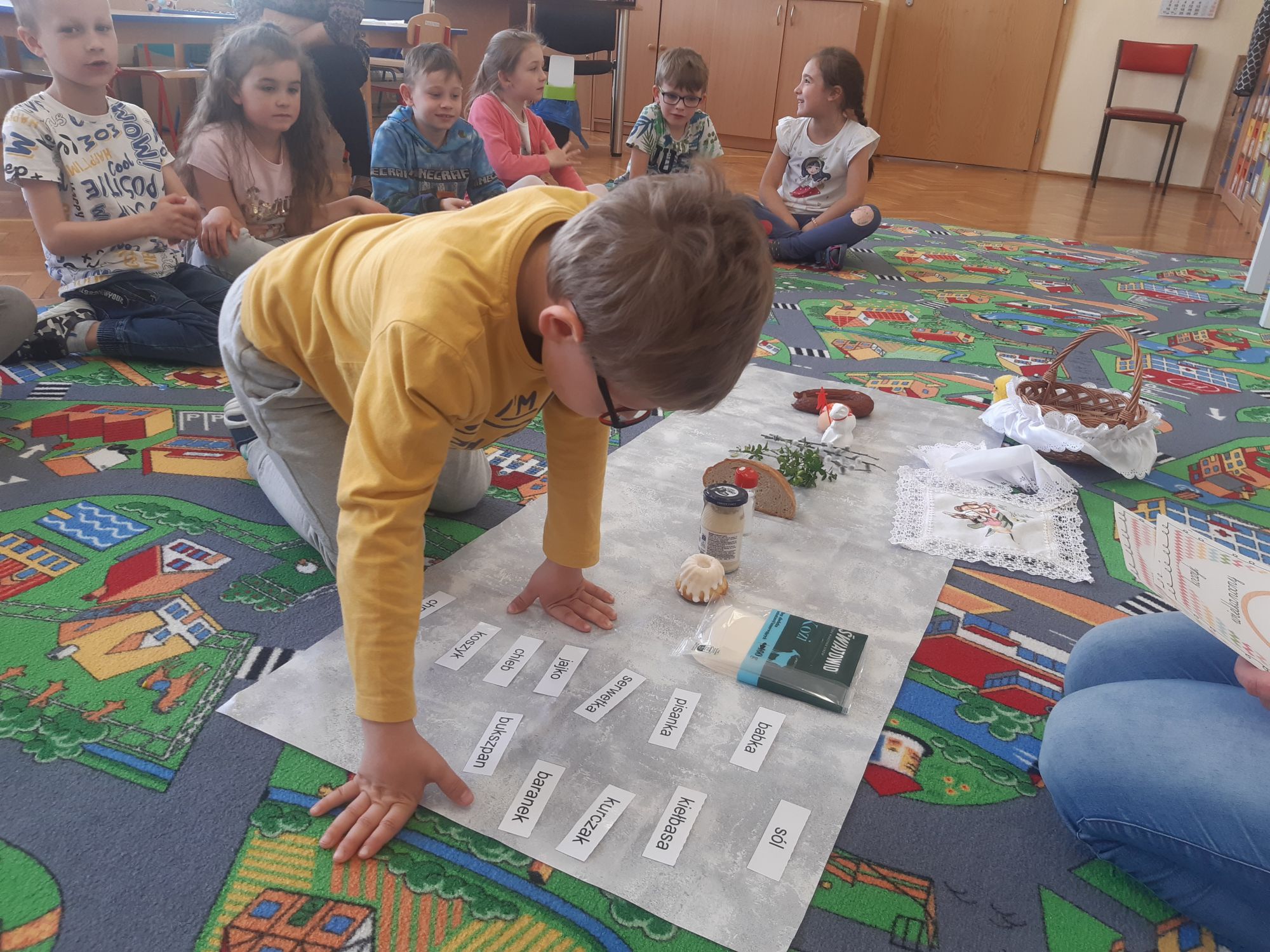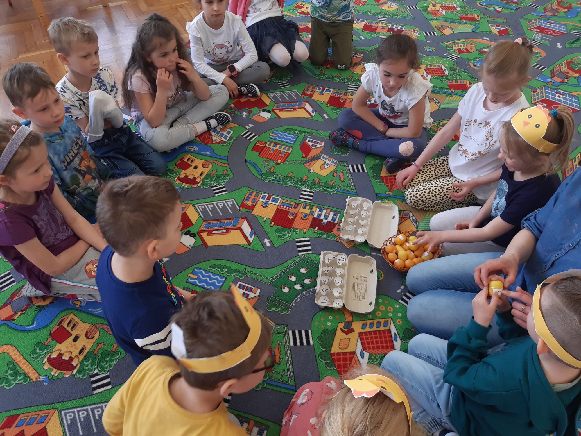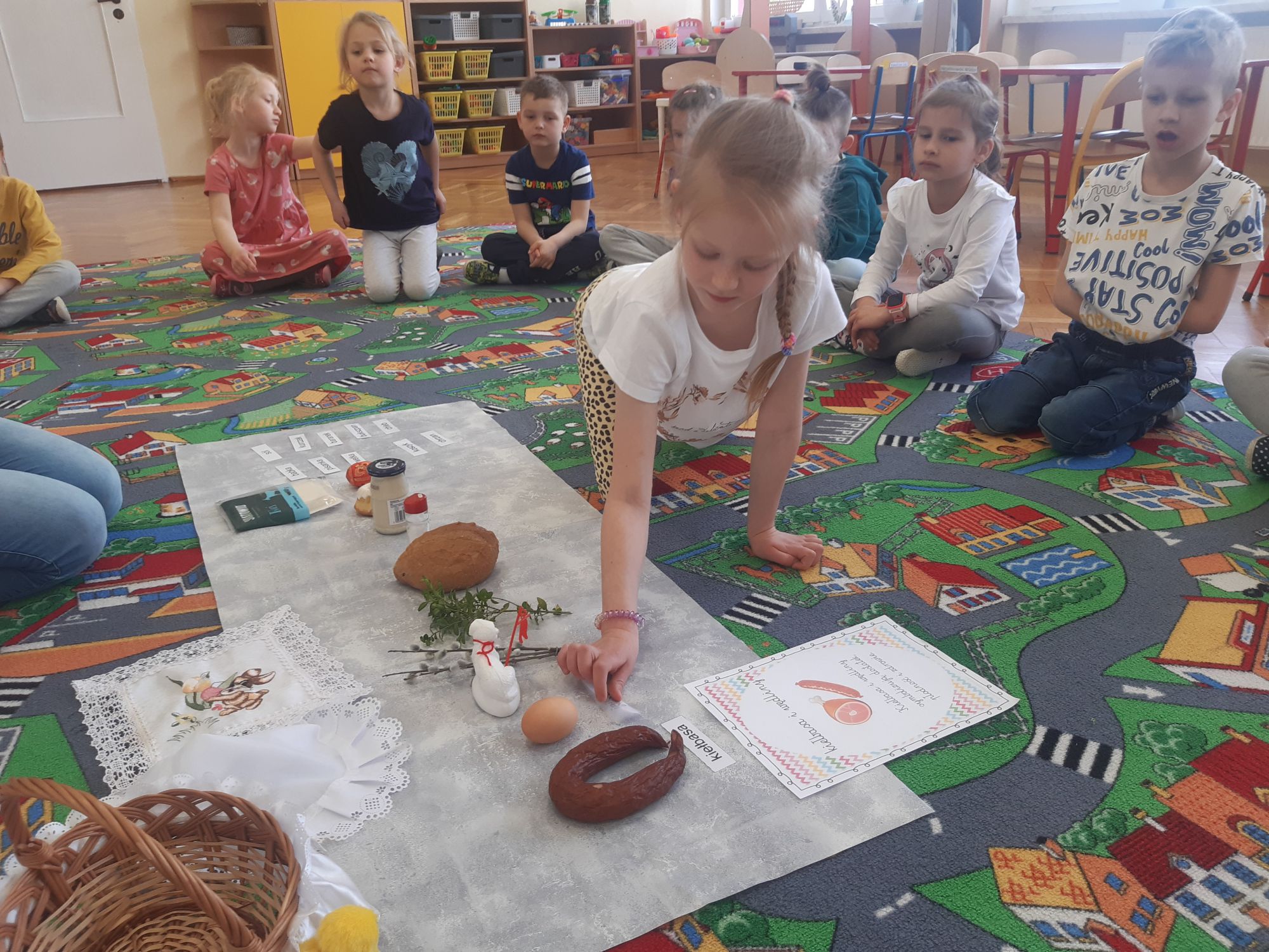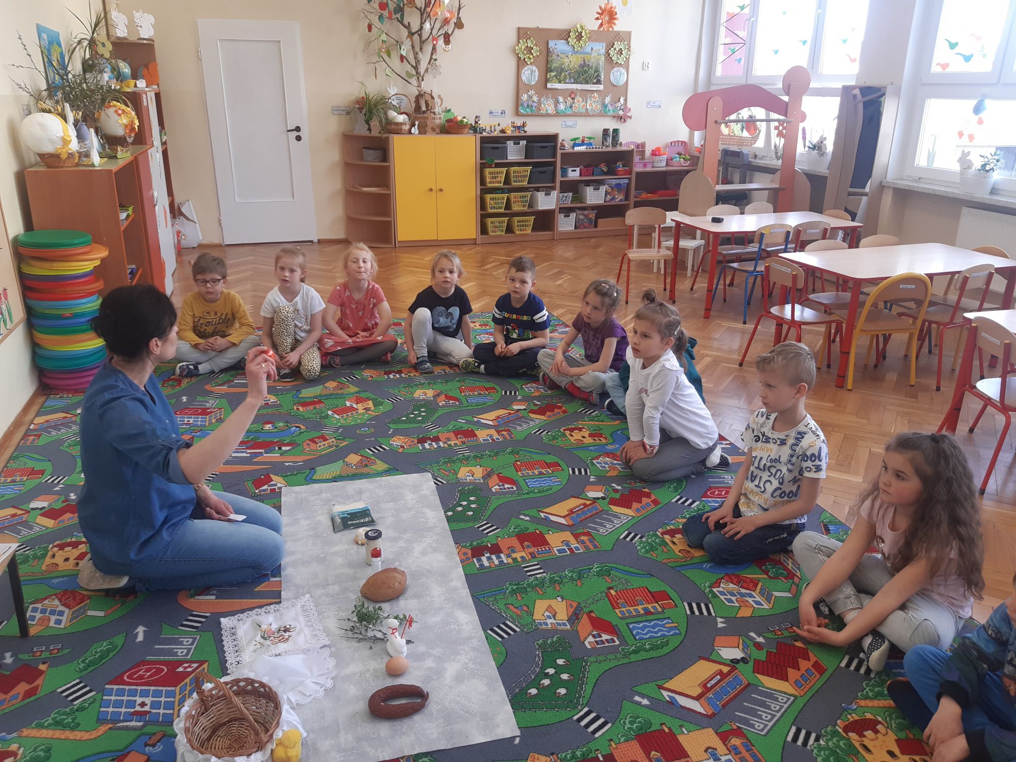 Pierwszym zadaniem dzieci był wysiew owsa i rzeżuchy, których zieleń symbolizuje budzące się życie. Każda grupa przygotowywała ciekawe ozdoby, które wymagały dużego zaangażowania i cierpliwości przy ich wykonaniu. Sale i korytarze naszego przedszkola wypełniły się pięknymi ozdobami świątecznymi. Nie zabrakło różnorodnych pisanek i kartek świątecznych oraz prac tematycznie związanych ze świętami. Aktywny udział dzieci w przygotowaniach pozwala bliżej poznać tradycje związane z Wielkanocą i wprowadza je w świąteczny nastrój oczekiwania. Dzieci poznawały i wymieniały tradycje jakie są co roku w ich domach: święcenie koszyczka z pokarmami, pieczenie bab wielkanocnych oraz polewanie się wodą w śmigus dyngus. W grupie „Wesołych Nutek” przedszkolaki ,idąc śladami czekoladowych jajeczek poszukiwały zajączka. Było dużo radości i niespodzianek.Niech te Święta Wielkiej Nocy będą czasem radośnie spędzonych wspólnie z dziećmi chwil!