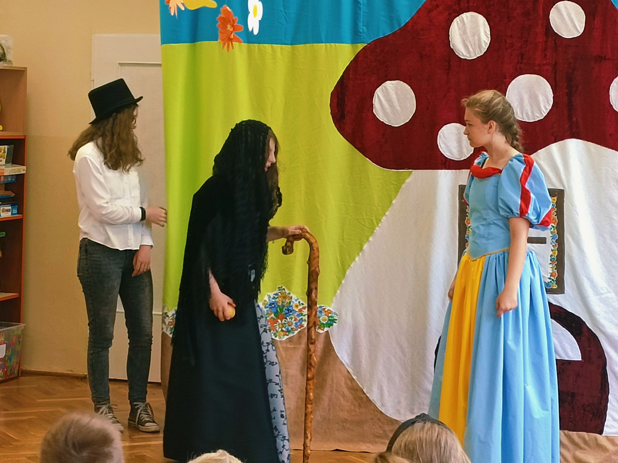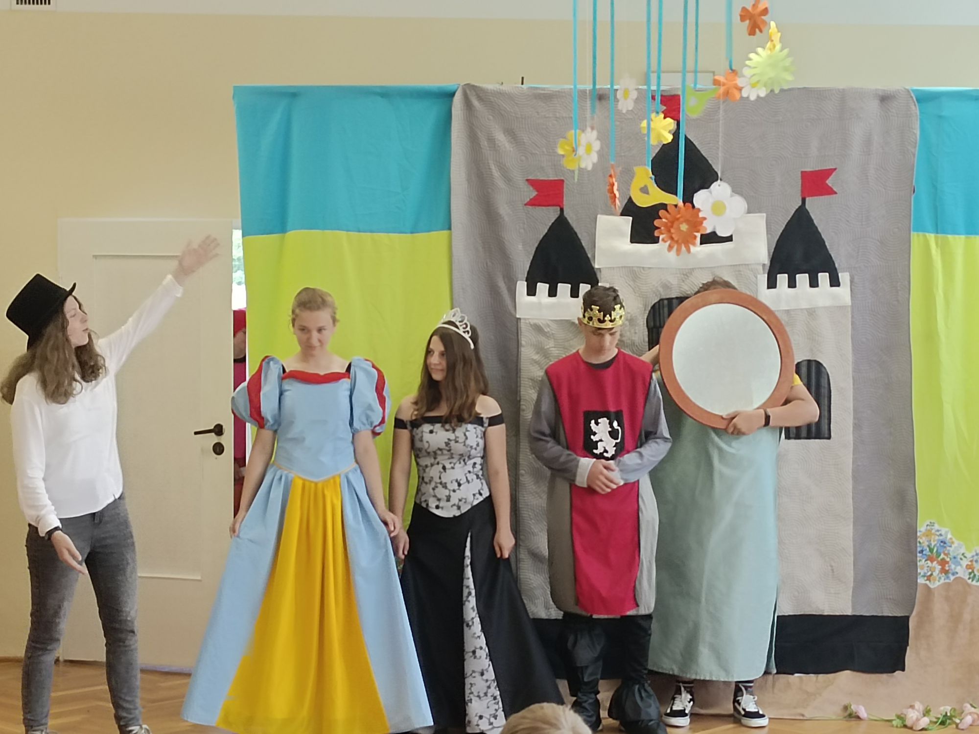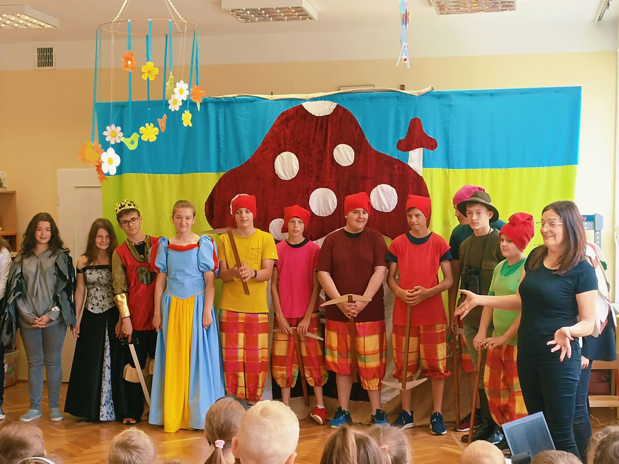 Dnia 21 czerwca 2022r. wzięliśmy udział w magicznym spektaklu pt.„Królewna Śnieżka i siedmiu krasnoludków” w wykonaniu uczniów Publicznej Szkoły Podstawowej Nr 2 w Ozimku. Reżyserią i choreografią zajęła się pani Ewa Dorynek – nauczycielka prowadząca szkolny zespół teatralny. Każdego z nas zachwyciły układy choreograficzne, nastrojowa oprawa muzyczna, bajkowe kostiumy i scenografia ! Hej ho, hej ho, na spektakl by się szło! Spektakl był oparty na motywach baśni braci Grimm „Królewna Śnieżka”. To opowieść o przyjaźni, miłości i walce dobra ze złem. Bajka uczy, że warto pomagać. Pokazuje, że zło i zazdrość to niszczące emocje.Barwne, pełne dobrego humoru przygody pięknej Śnieżki i krasnoludków poruszają serca i wyobraźnię młodego widza. Na największe uznanie zasługują jednak młodzi aktorzy. Świadomie i z widoczną wprawą operowali też gestem, mimiką, a nade wszystko głosem. To właśnie dzięki grze aktorskiej spektakl był wartki, dynamiczny, a przy tym bardzo przejrzysty i zrozumiały nawet dla najmłodszych widzów, którzy reagowali bardzo żywiołowo. Gratulujemy twórcom i dziękujemy, że raz jeszcze mieliśmy okazję spotkać się z postaciami ze znanej co prawda, ale wciąż żywej i aktualnej baśni.