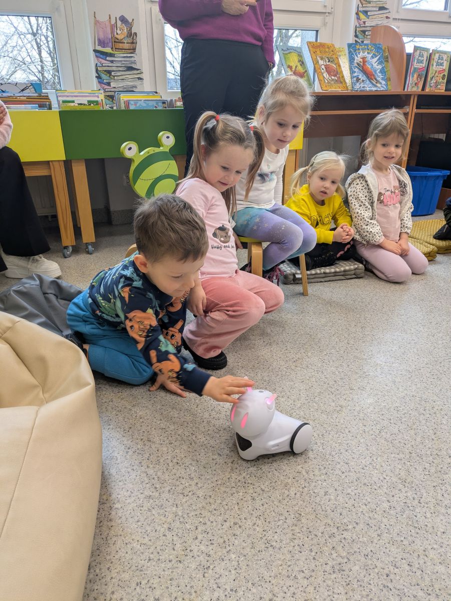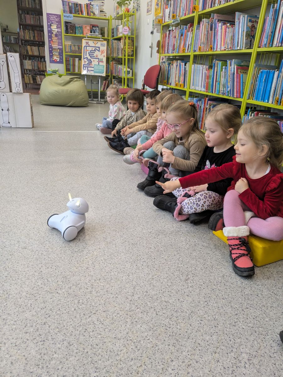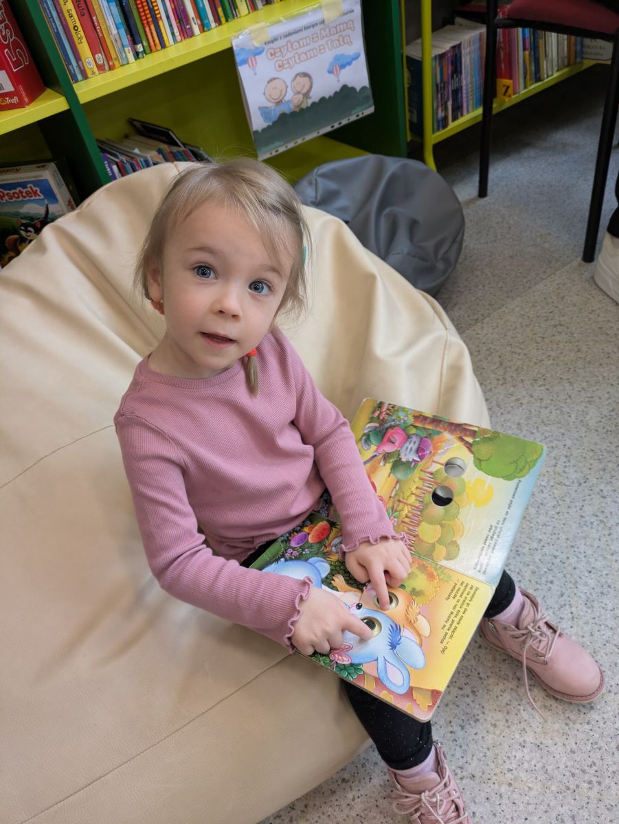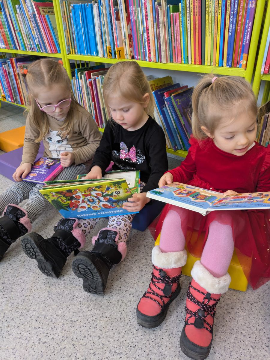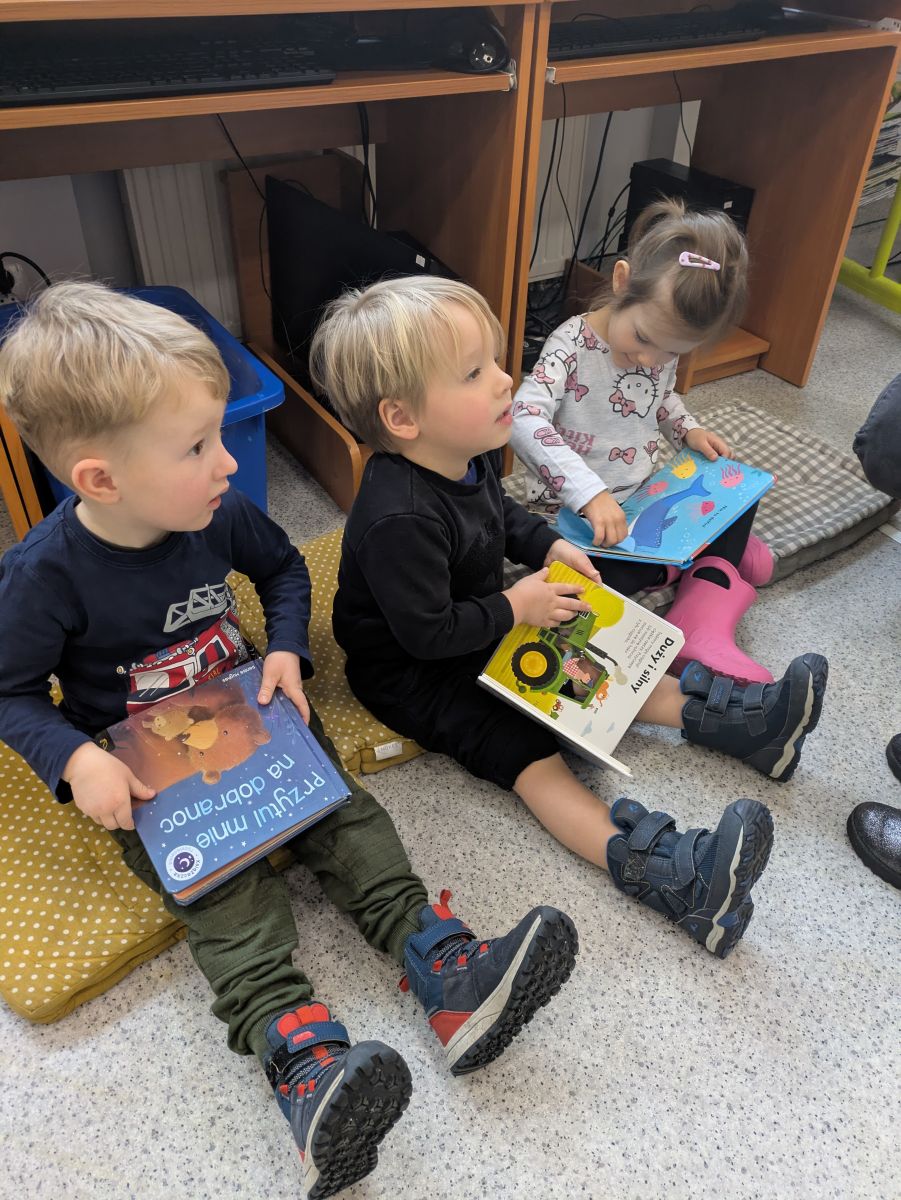Dla wielu przedszkolaków było to wyjątkowe wydarzenie – pierwsze spotkanie z prawdziwą biblioteką i tak dużą ilością książek w jednym miejscu. Na miejscu powitały nas Panie Bibliotekarki, która opowiedziały dzieciom, jak należy zachowywać się w bibliotece oraz jak dbać o książki. Przedszkolaki z zaciekawieniem słuchały o zasadach wypożyczania oraz o tym, jak zostać czytelnikiem. Największą radość sprawiło dzieciom oglądanie kolorowych książeczek, bogato ilustrowanych bajek i opowiadań.Nie zabrakło również wspólnego czytania. Dzieci z ogromnym skupieniem wysłuchały ciekawej historii, aktywnie odpowiadały na pytania i dzieliły się swoimi spostrzeżeniami. Wizyta była nie tylko okazją do poznania nowego miejsca, ale także do rozwijania zainteresowań czytelniczych i kształtowania szacunku do książek.Spotkanie przebiegło w bardzo miłej i serdecznej atmosferze. Dla Delfinków była to wspaniała przygoda, która – mamy nadzieję – stanie się początkiem częstych odwiedzin w bibliotece oraz pięknej przyjaźni z książką.