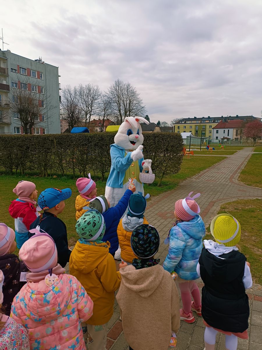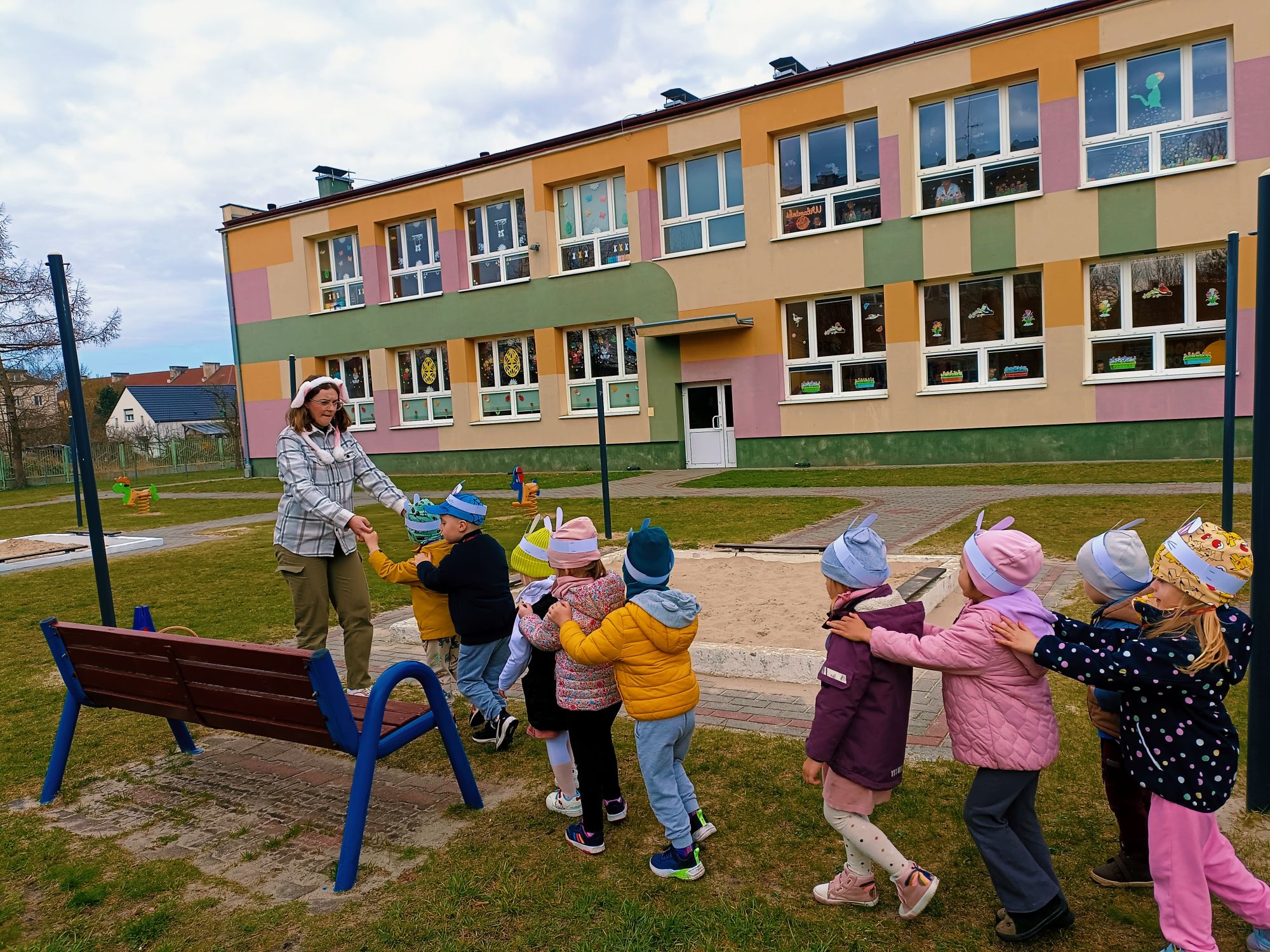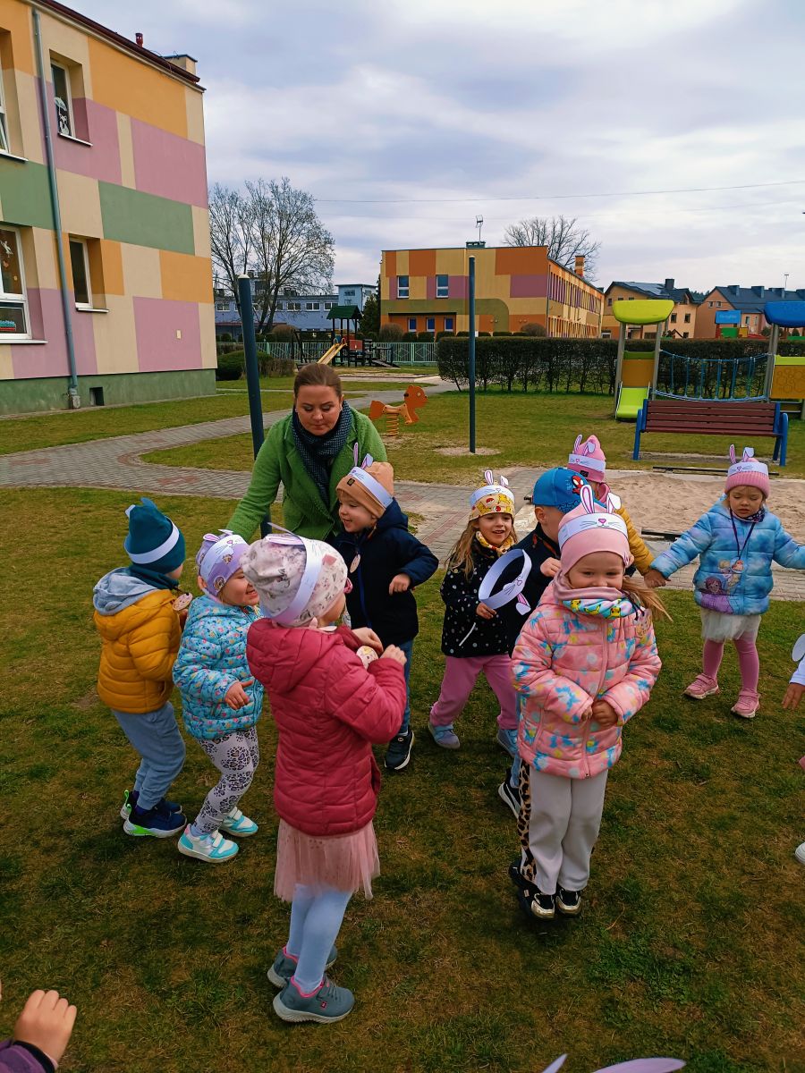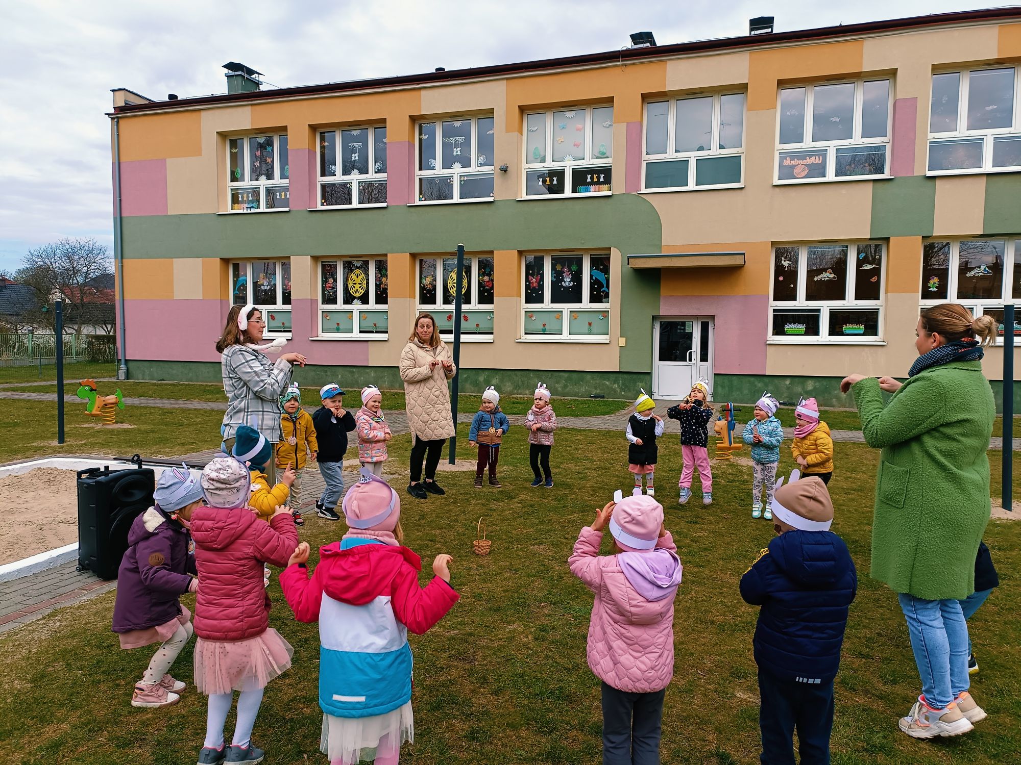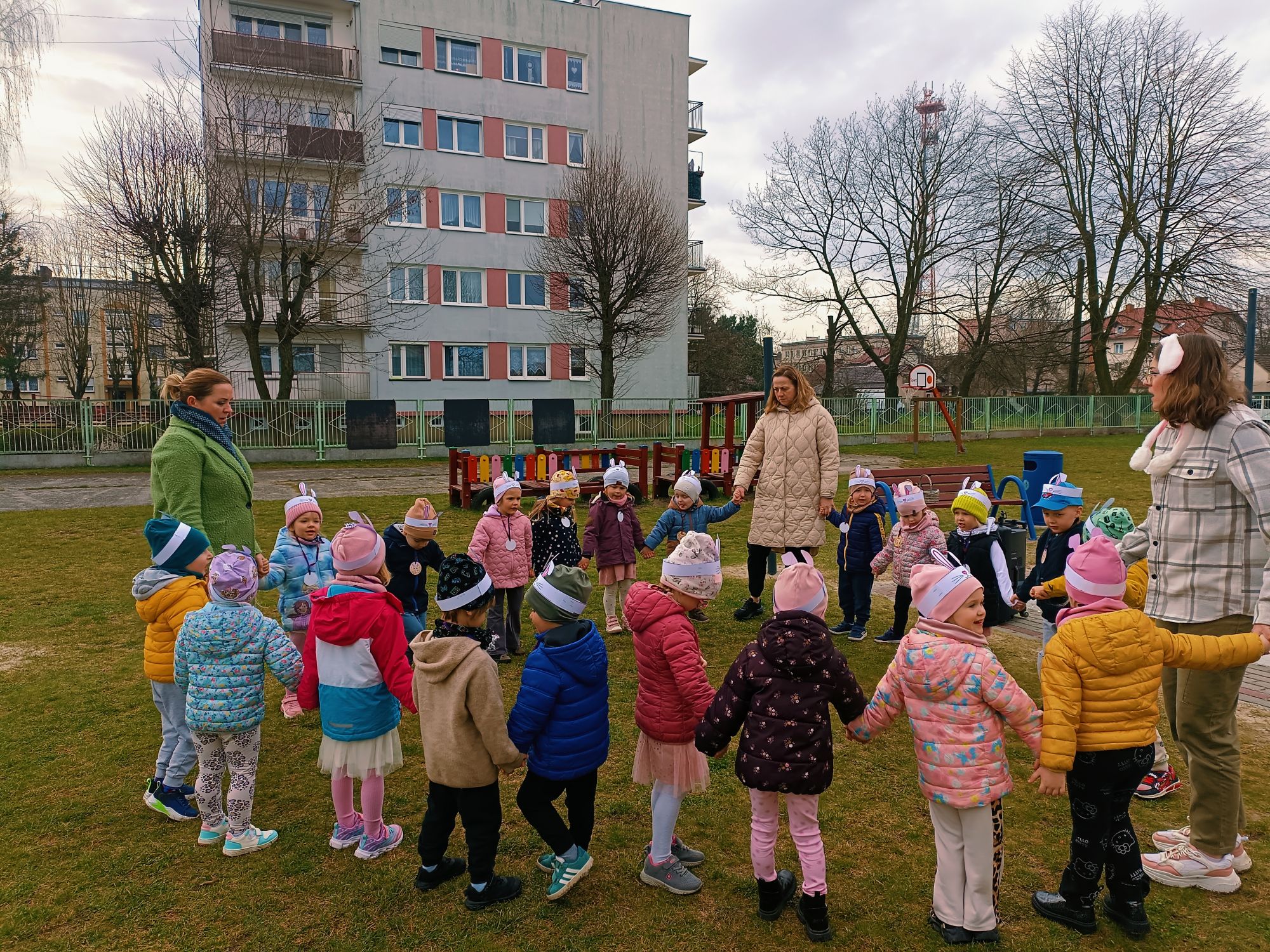 W Wielki Czwartek, 2 kwietnia, w przedszkolnym ogrodzie Przedszkola Publicznego Nr 1 w Ozimku odbyło się radosne wydarzenie – „Szukanie Zajączka”, w którym wzięły udział dzieci z grupy Delfinki. Tego dnia na najmłodszych czekało wiele wesołych aktywności inspirowanych tradycjami wielkanocnymi. Zabawa rozpoczęła się od „skoków zajączka”, podczas których dzieci pokonywały wyznaczoną trasę, naśladując ruchy wiosennego bohatera. Następnie, przy piosence „Cóż to za nowina?”, przedszkolaki wcielały się w różne zwierzątka, rozwijając swoją wyobraźnię i zdolności ruchowe. Dużo radości sprawiło dzieciom szukanie kolorowych jajek ukrytych w ogrodzie. Kolejnym punktem programu było wspólne śpiewanie znanej dzieciom piosenki „Hop Hop Easter Bunny”, która wprowadziła element języka angielskiego do zabawy. Nie zabrakło także zadań integracyjnych – podczas układania wielkanocnych puzzli, dzieci odnajdywały swoje pary, dopasowując połówki pisanek. Wspólny „taniec zajączków” przy muzyce dostarczył wszystkim wiele śmiechu i ruchu. Na zakończenie dzieci udały się na drugi plac zabaw, gdzie czekała na nie niespodzianka – wielkanocne „paczuszki - niespodzianki” ukryte przez zajączka, który pojawił się w Jedyneczce we własnej osobie. Był to wyjątkowy dzień pełen radości, współpracy i świątecznej atmosfery.