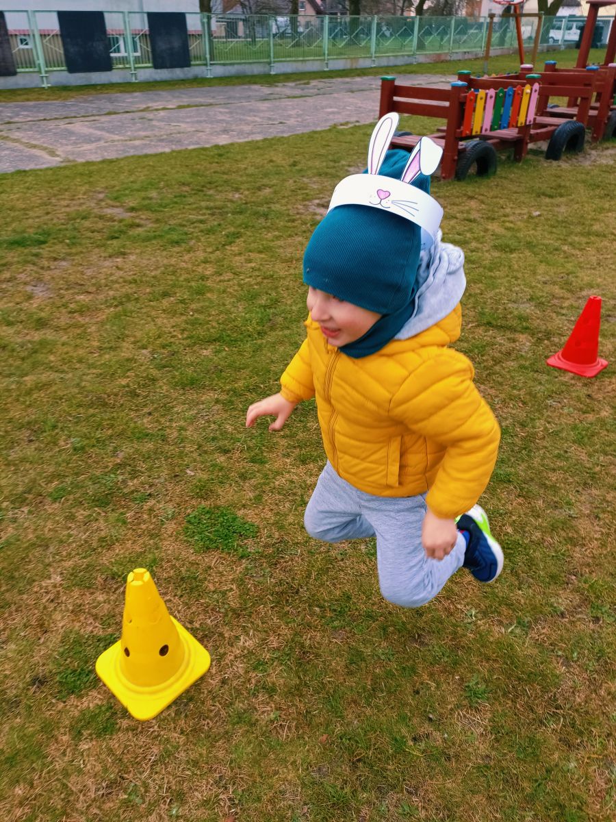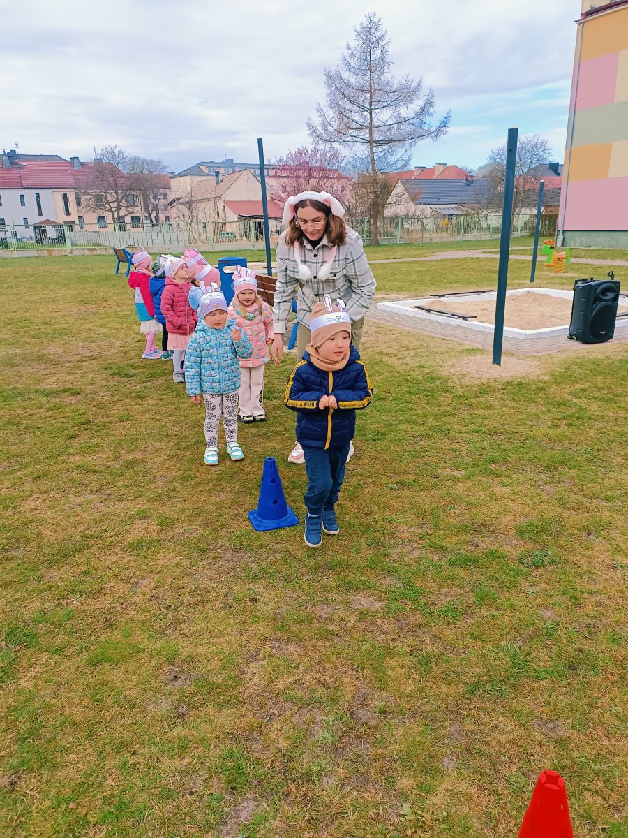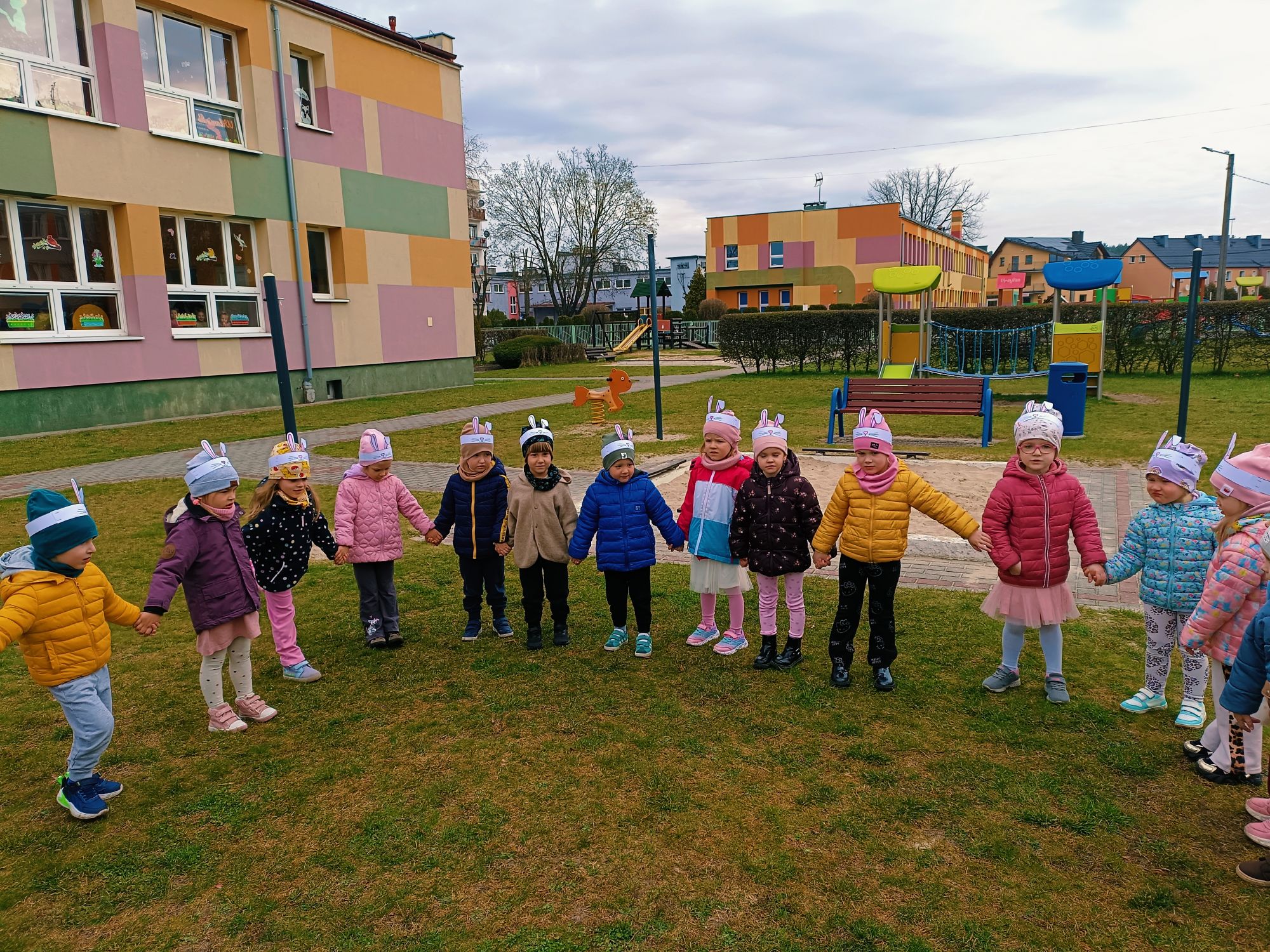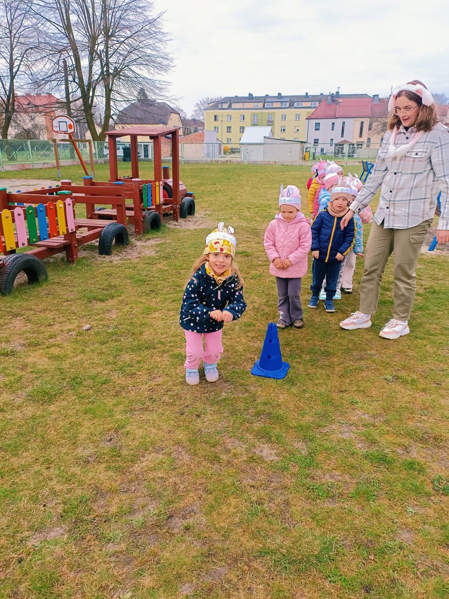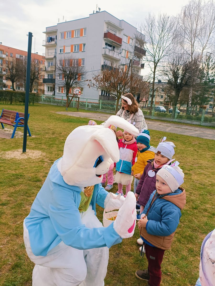 W Wielki Czwartek, 2 kwietnia, w przedszkolnym ogrodzie Przedszkola Publicznego Nr 1 w Ozimku odbyło się radosne wydarzenie – „Szukanie Zajączka”, w którym wzięły udział dzieci z grupy Delfinki. Tego dnia na najmłodszych czekało wiele wesołych aktywności inspirowanych tradycjami wielkanocnymi. Zabawa rozpoczęła się od „skoków zajączka”, podczas których dzieci pokonywały wyznaczoną trasę, naśladując ruchy wiosennego bohatera. Następnie, przy piosence „Cóż to za nowina?”, przedszkolaki wcielały się w różne zwierzątka, rozwijając swoją wyobraźnię i zdolności ruchowe. Dużo radości sprawiło dzieciom szukanie kolorowych jajek ukrytych w ogrodzie. Kolejnym punktem programu było wspólne śpiewanie znanej dzieciom piosenki „Hop Hop Easter Bunny”, która wprowadziła element języka angielskiego do zabawy. Nie zabrakło także zadań integracyjnych – podczas układania wielkanocnych puzzli, dzieci odnajdywały swoje pary, dopasowując połówki pisanek. Wspólny „taniec zajączków” przy muzyce dostarczył wszystkim wiele śmiechu i ruchu. Na zakończenie dzieci udały się na drugi plac zabaw, gdzie czekała na nie niespodzianka – wielkanocne „paczuszki - niespodzianki” ukryte przez zajączka, który pojawił się w Jedyneczce we własnej osobie. Był to wyjątkowy dzień pełen radości, współpracy i świątecznej atmosfery.