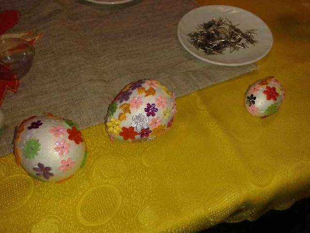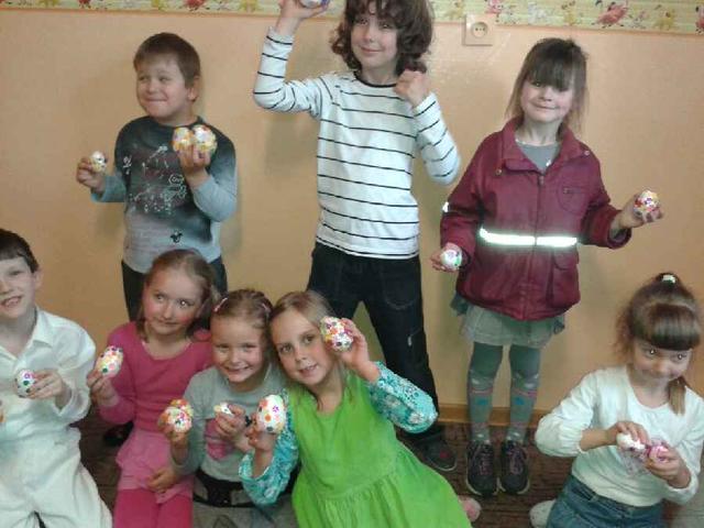 14 kwietnia przedszkolaki z grupy VI wraz z Rodzicami stroiły wielkanocne jajka. Zaopatrzeni w „górę” szpilek, kwiatów, cekinów i innych dekoracji podjęliśmy się tego wyzwania z nadzieją, że uda się nam włożyć je do koszyczków wielkanocnych w … całości. Jajka wyszły rewelacyjnie. Dzieci współpracowały z Rodzicami „jak należy”, a sami Rodzice – cierpliwie nakłuwali każdy element na szpileczkę. Spotkanie odbyło się w życzliwej atmosferze, a klimat Świąt Wielkanocnych to zasługa przedszkolaków, które na wstępie - dały wspaniały popis swoich umiejętności wokalnych, recytatorskich i tanecznych. Aby tradycji stało się zadość – każde dziecko opryskało „śmigusową” sikawką swoją Mamę… Dziękujemy Państwu za udział w tych zajęciach. Życzymy Wesołych Świąt.