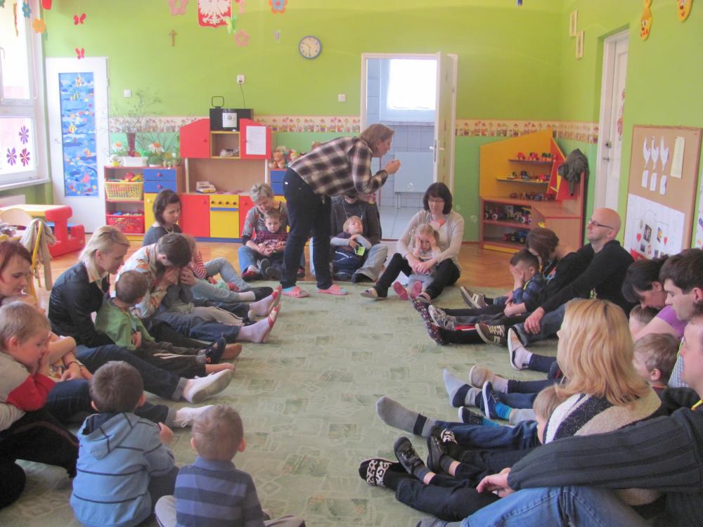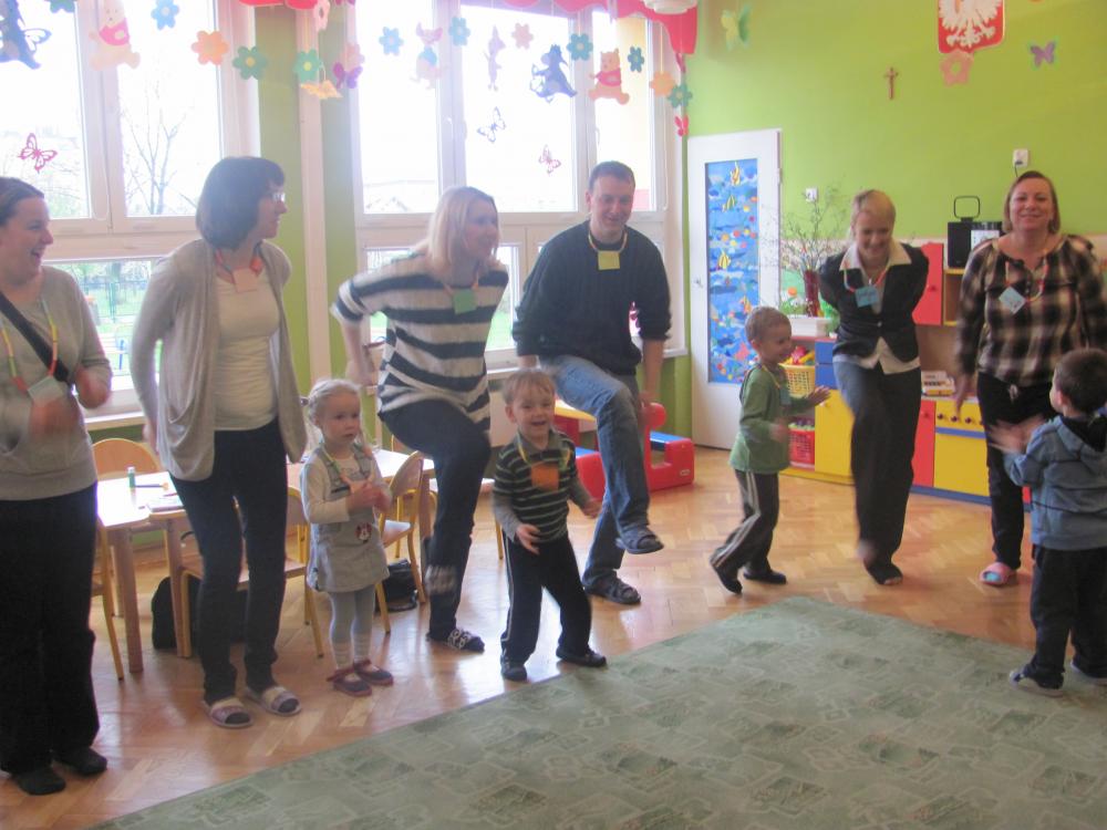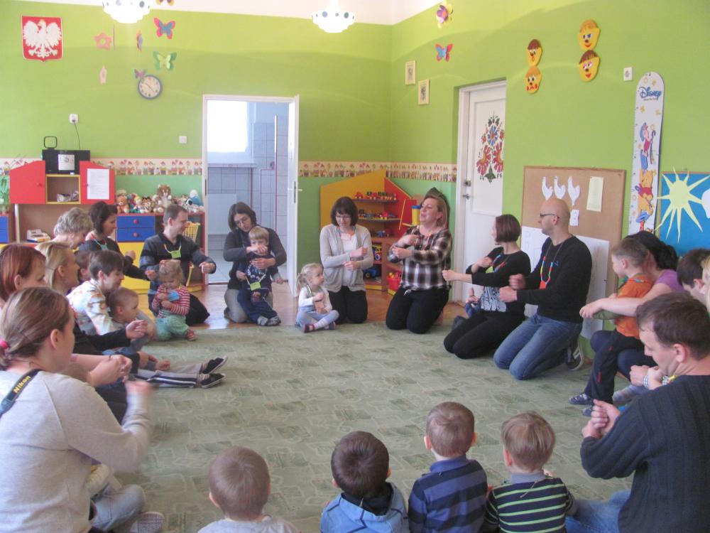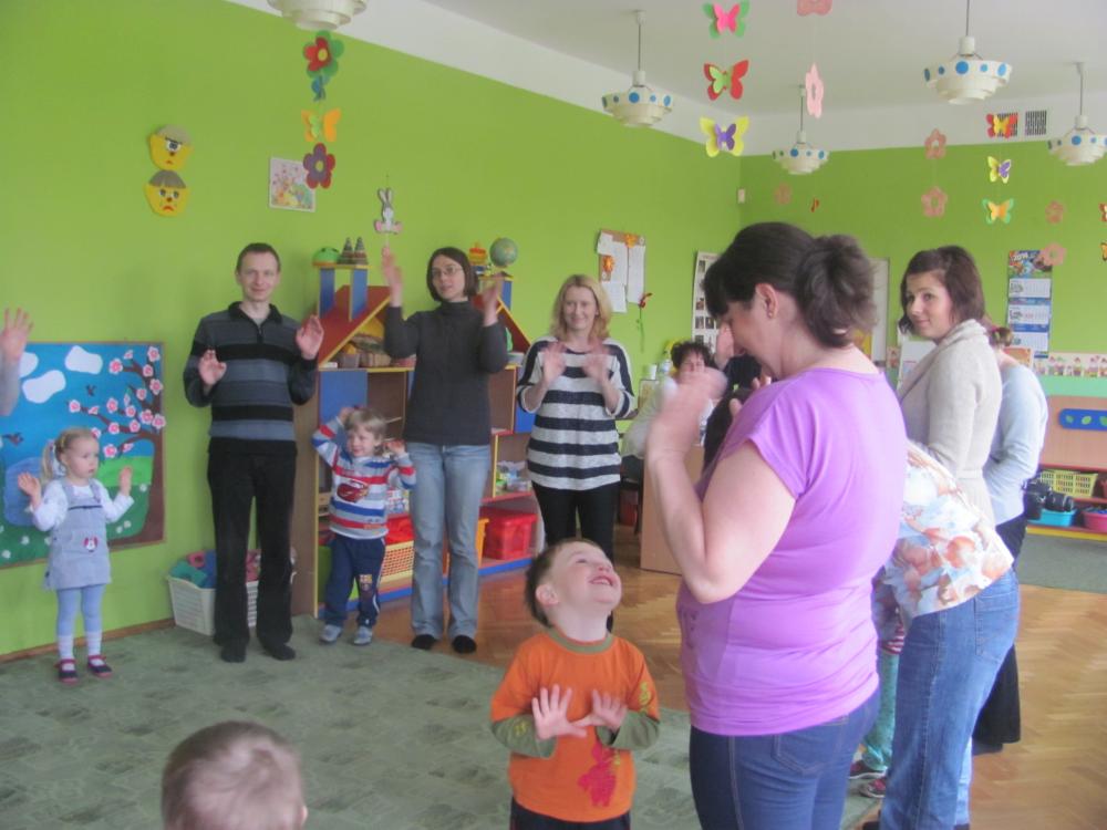 Rodzice pomimo licznych obowiązków znaleźli czas i przybyli na spotkanie. Celem zajęć była twórcza interpretacja muzyki m.in. pedagogika zabawy (KLANZA) oraz Batti Strauss, jak również wspólna zabawa, rozwijanie umiejętności rytmicznego poruszania się z akompaniamentem, doskonalenie motoryki małej i dużej, stwarzanie sytuacji sprzyjających rozwijaniu myślenia.