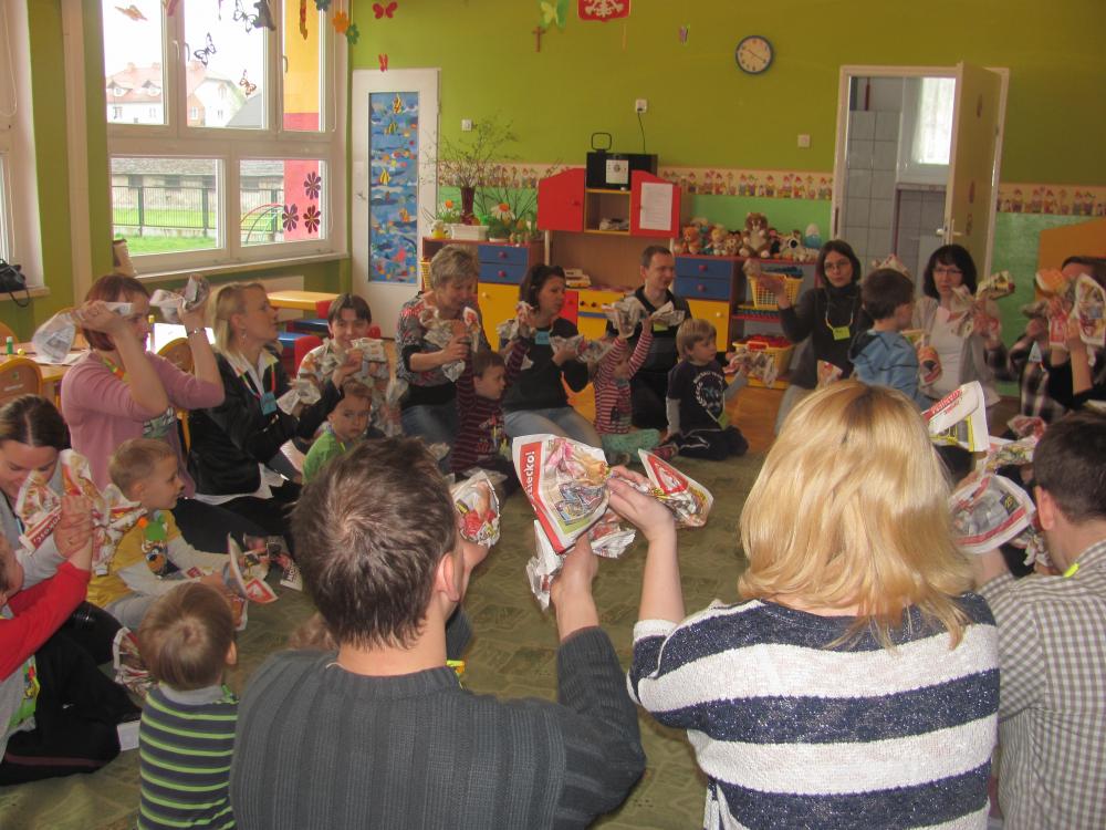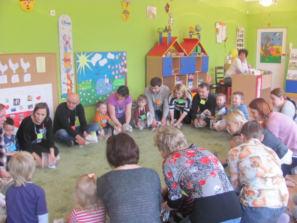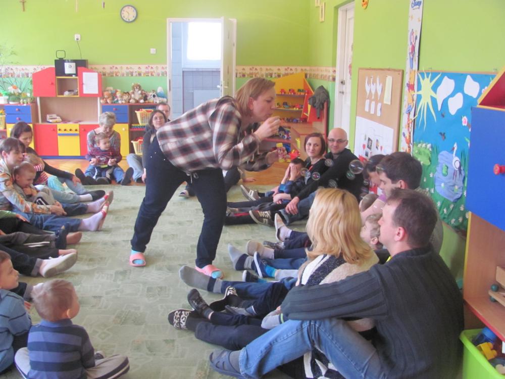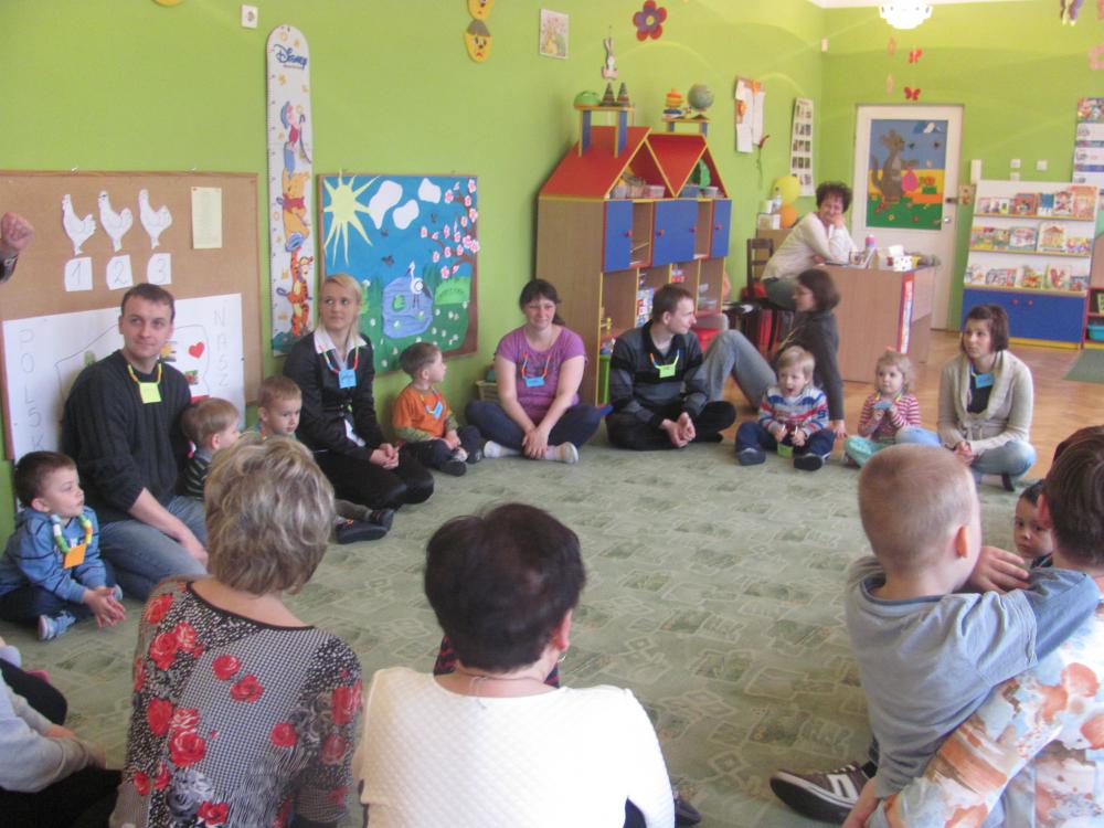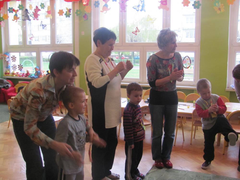 Rodzice pomimo licznych obowiązków znaleźli czas i przybyli na spotkanie. Celem zajęć była twórcza interpretacja muzyki m.in. pedagogika zabawy (KLANZA) oraz Batti Strauss, jak również wspólna zabawa, rozwijanie umiejętności rytmicznego poruszania się z akompaniamentem, doskonalenie motoryki małej i dużej, stwarzanie sytuacji sprzyjających rozwijaniu myślenia.