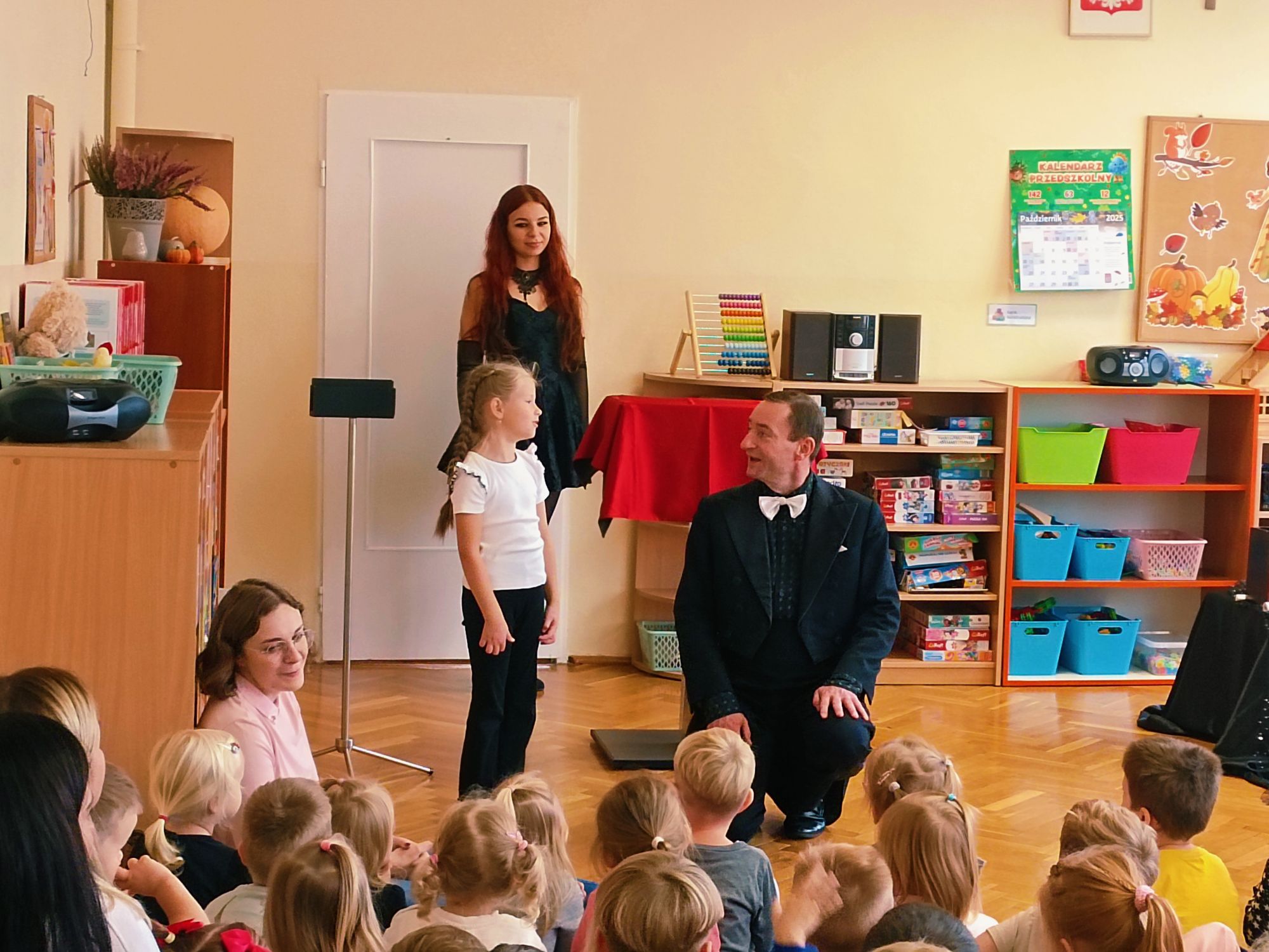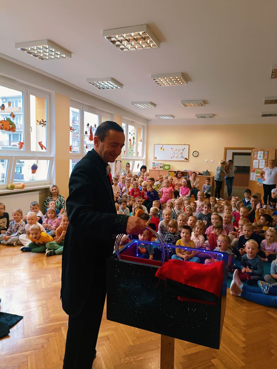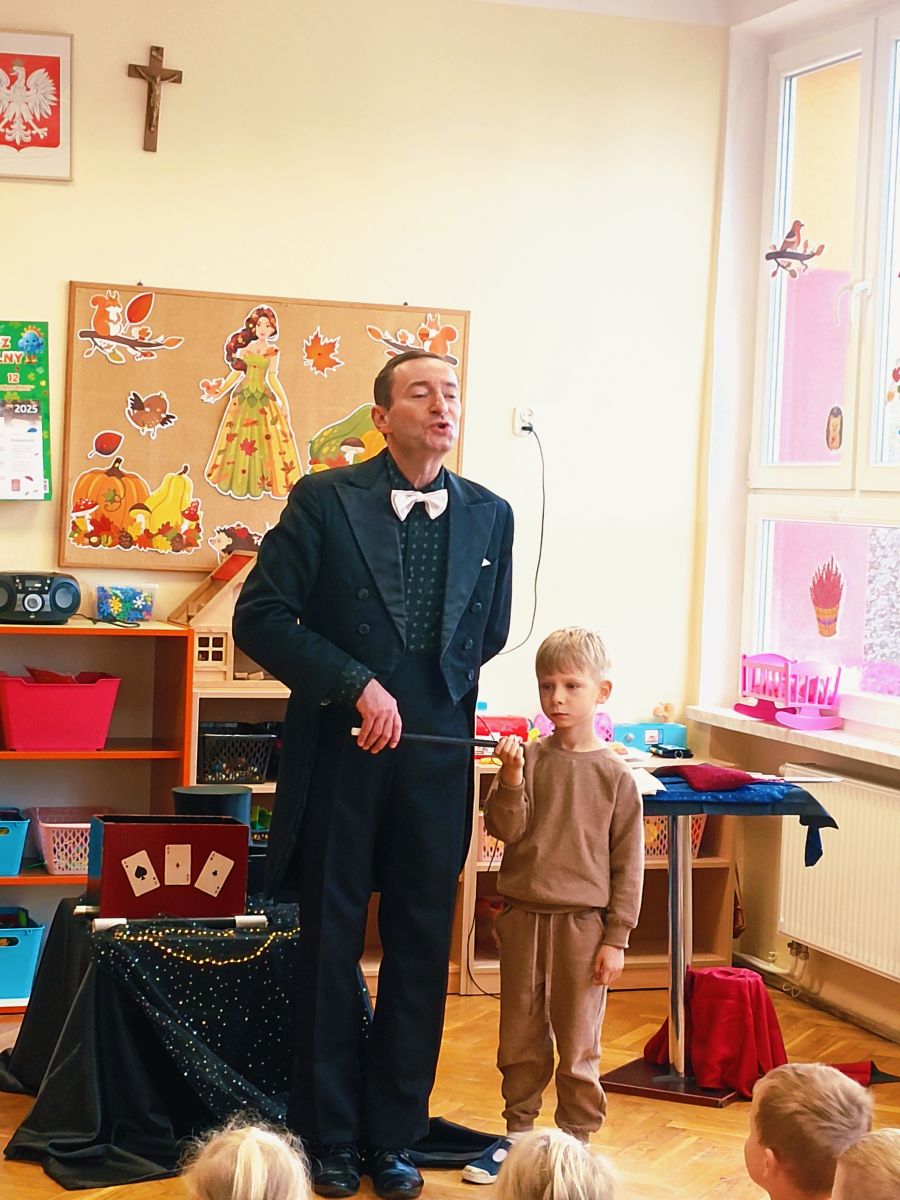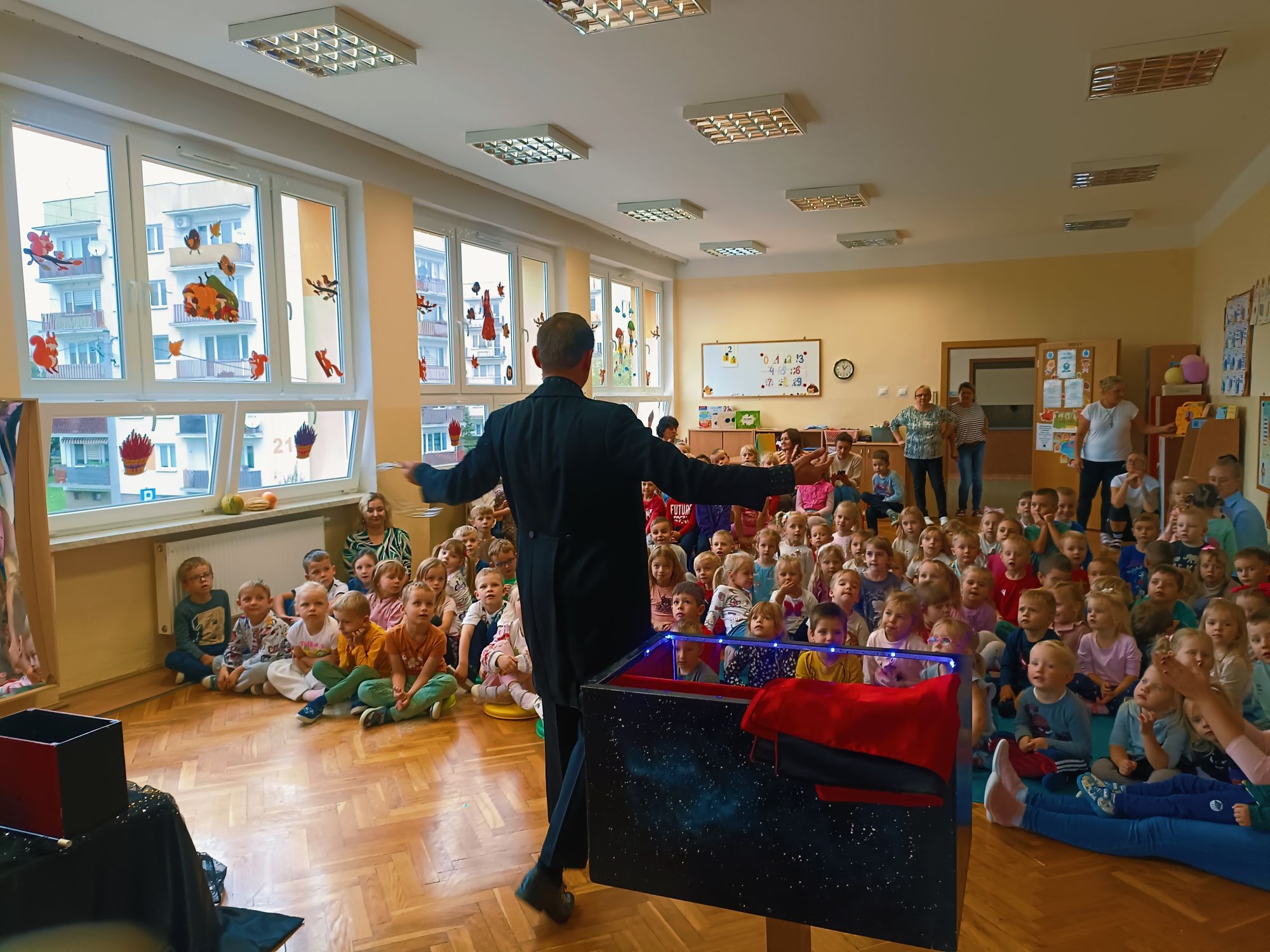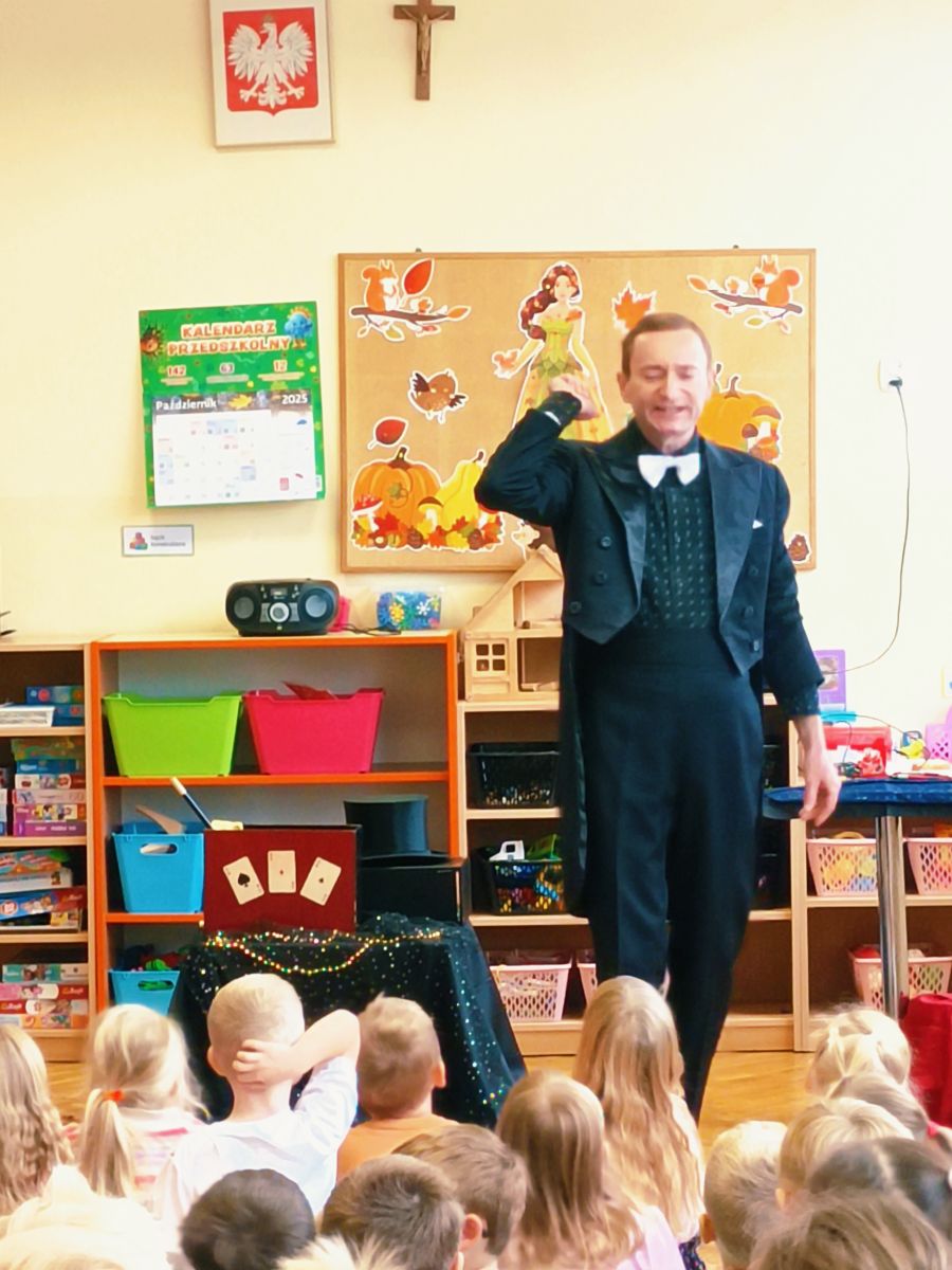 10 października 2025r. Przedszkole Publiczne Nr 1 w Ozimku odwiedził iluzjonista Marcin Klęk wraz ze swoją asystentką, który zabrał dzieci w swoją magiczną podróż. Pokaz iluzji wzbudził w dzieciach ciekawość, uruchomił wyobraźnię i fascynował je. Przebiegał w taki sposób, by jego uczestnicy nie byli tylko biernymi obserwatorami, ale również brali czynny udział w prezentowaniu trików. Odwiedziny prawdziwego magika to bez wątpienia wielka atrakcja dla naszych przedszkolaków!