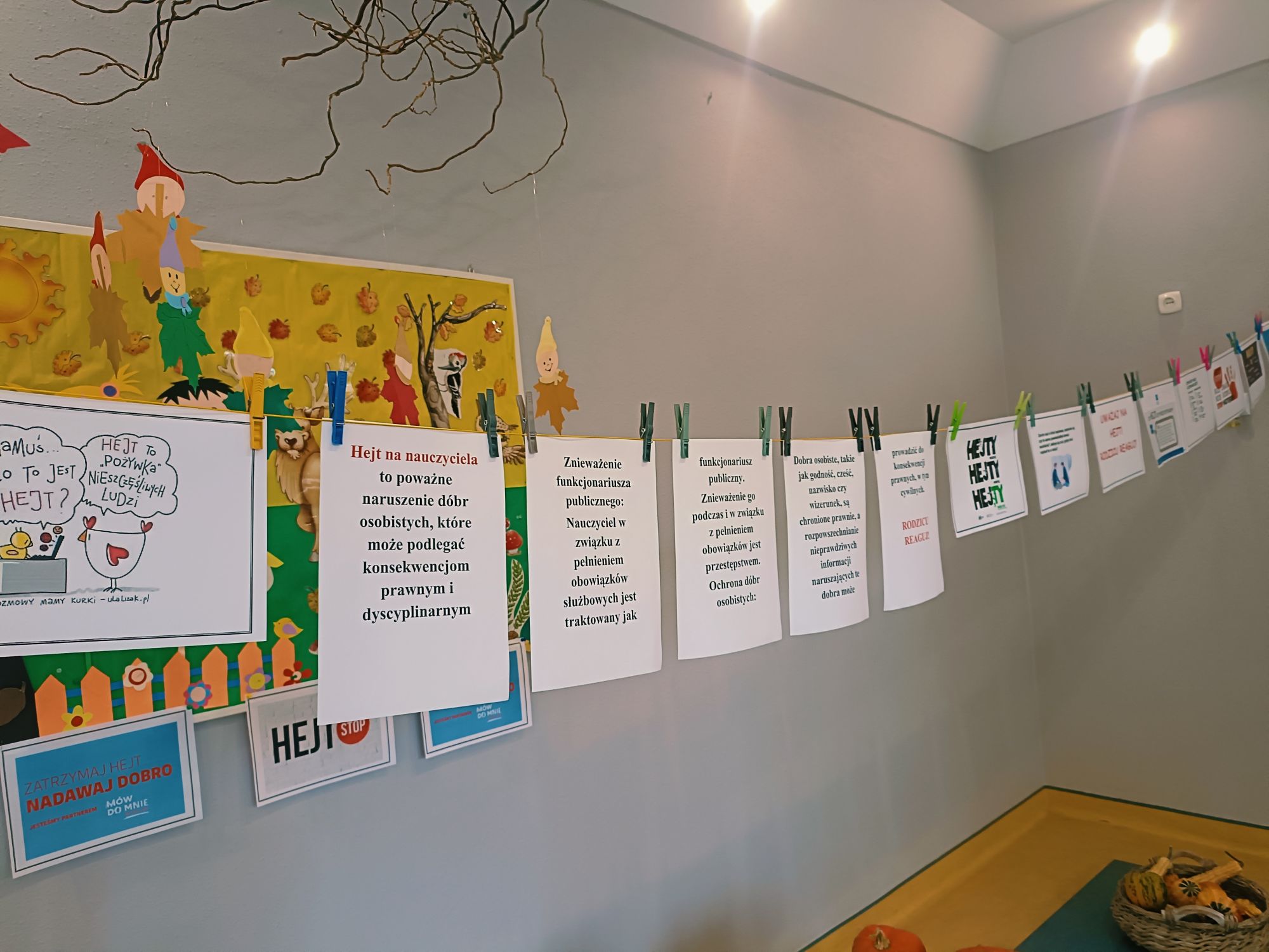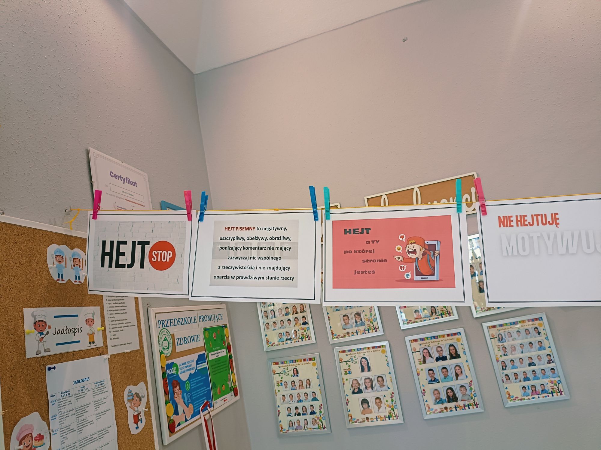 Internet, choć niewątpliwie jest źródłem informacji oraz rozrywki, jest też miejscem, gdzie dzieci mogą się natknąć na treści niebezpieczne. W związku z powyższym w tym tygodniu przeprowadzono zajęcia dotyczące form cyberprzemocy, które polegają na obrażaniu w sieci innych osób. Nad przebiegiem zajęć warsztatowych czuwały wychowawczynie wszystkich grup przedszkolnych. W głównym holu przedszkola została wykonana wystawa edukacyjna dla dzieci i ich rodziców.