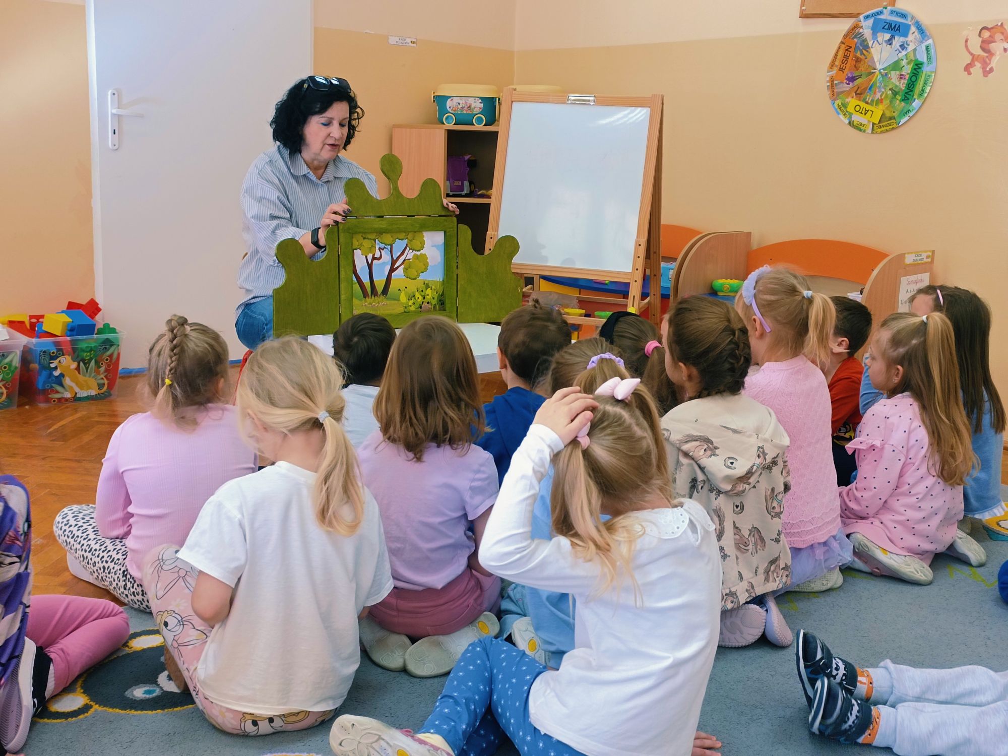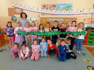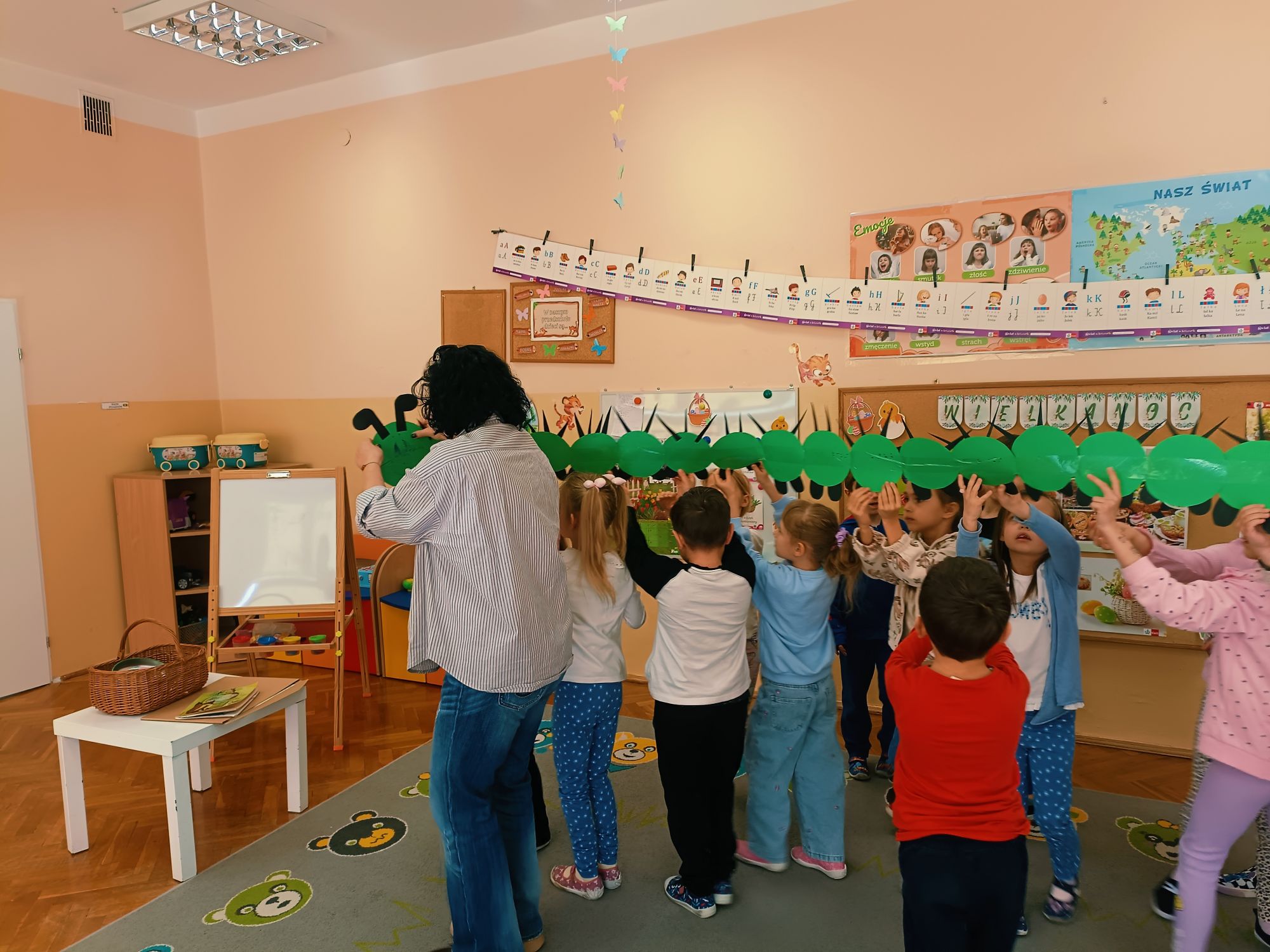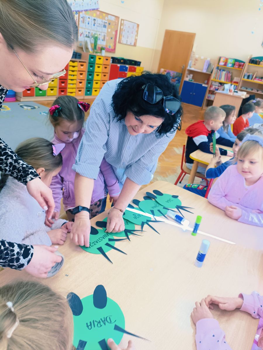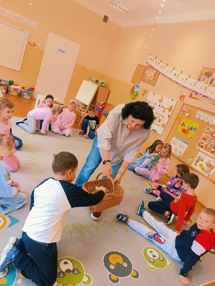 Tuż przed świętami, 1 kwietnia 2026 roku Przedszkole Publiczne Nr 1 w Ozimku ,grupę tygrysków odwiedziła pani Grażyna Świercz bibliotekarz i nauczyciel Publicznej Szkoły Podstawowej Nr 1 w Ozimku. Pani Grażynka przedstawiła dzieciom opowieść „magiczna gąsienica” w formie teatrzyku kamishibai. Była to o gąsienicy, która zamieniła się w motyla. Dziwna i zarazem urocza gąsienica, która pragnie latać, spełnia swoje marzenia! Bajka przedstawiała poszczególne etapy rozwoju motyla (cykl życia motyla), jak w naturalny i jednocześnie „magiczny sposób” z gąsienicy powstaje piękny motyl. Następnie dzieci zostały zaproszone do wykonania papierowej gąsienicy. Po pracy plastycznej były wiosenne zabawy przy wykorzystaniu bardzo atrakcyjnych pomocy dydaktycznych. Po zajęciach dzieci wręczyły pani Grażynce podziękowanie, a same zostały obdarowane słodkimi upominkami. Dziękujemy bardzo za przeprowadzone zajęcia, które urozmaiciły przedszkolakom ten wiosenno- świąteczny czas.