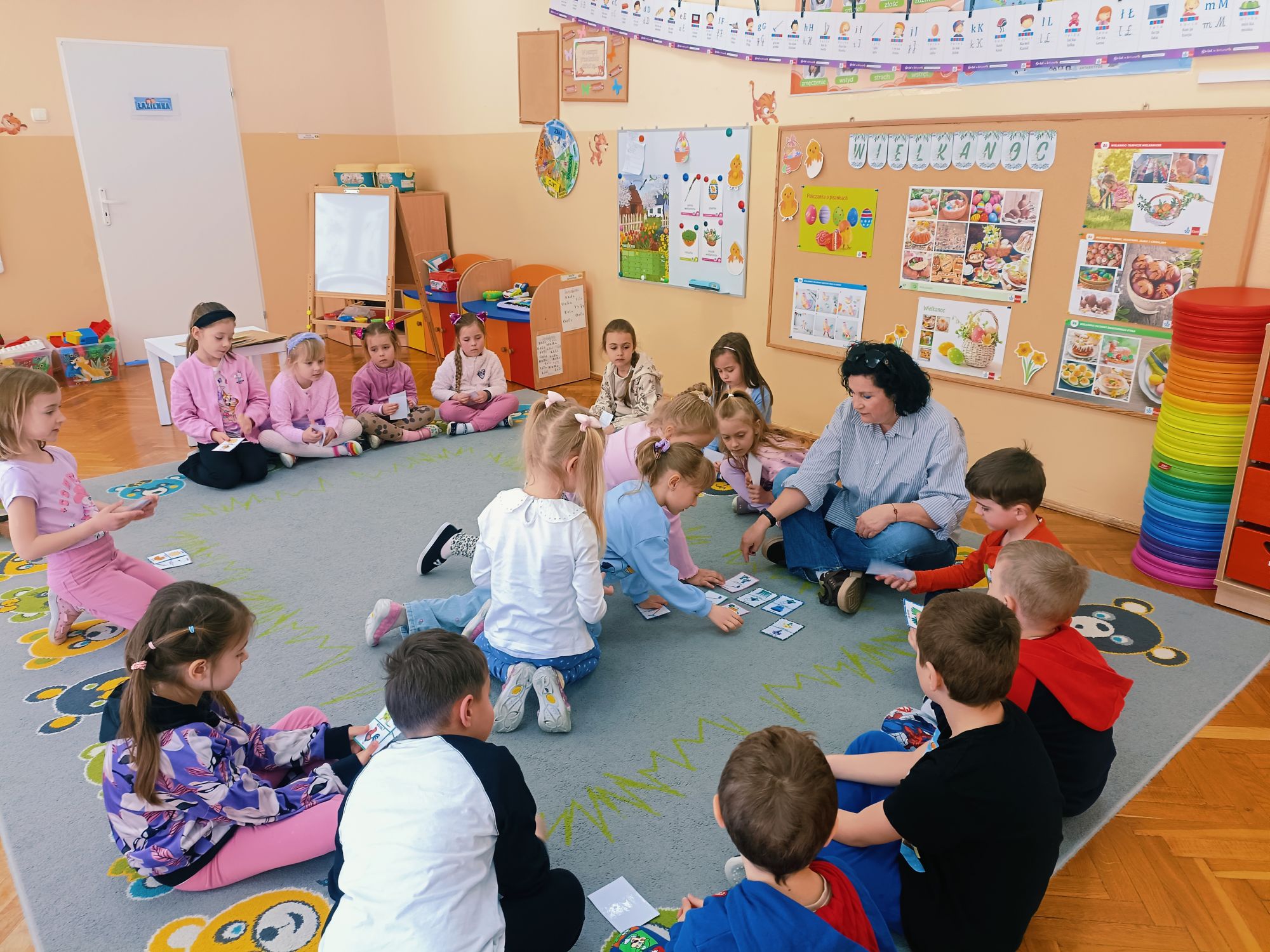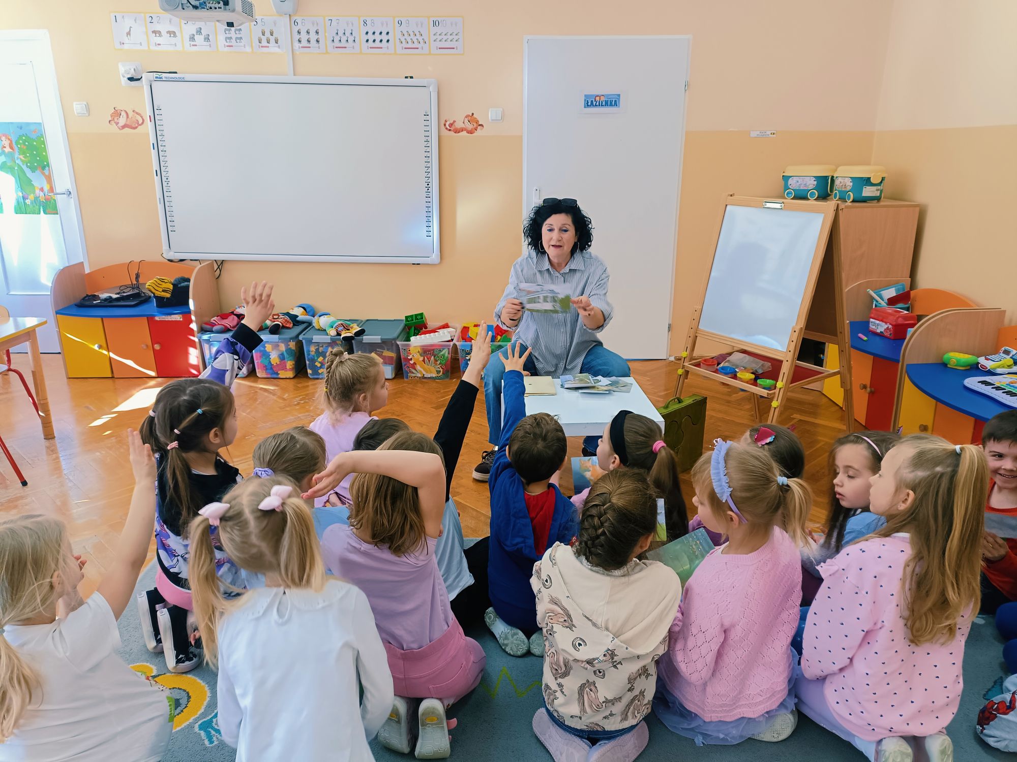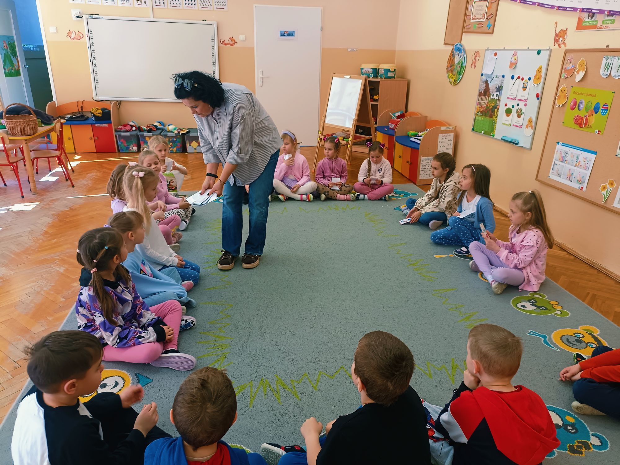 Tuż przed świętami, 1 kwietnia 2026 roku Przedszkole Publiczne Nr 1 w Ozimku ,grupę tygrysków odwiedziła pani Grażyna Świercz bibliotekarz i nauczyciel Publicznej Szkoły Podstawowej Nr 1 w Ozimku. Pani Grażynka przedstawiła dzieciom opowieść „magiczna gąsienica” w formie teatrzyku kamishibai. Była to o gąsienicy, która zamieniła się w motyla. Dziwna i zarazem urocza gąsienica, która pragnie latać, spełnia swoje marzenia! Bajka przedstawiała poszczególne etapy rozwoju motyla (cykl życia motyla), jak w naturalny i jednocześnie „magiczny sposób” z gąsienicy powstaje piękny motyl. Następnie dzieci zostały zaproszone do wykonania papierowej gąsienicy. Po pracy plastycznej były wiosenne zabawy przy wykorzystaniu bardzo atrakcyjnych pomocy dydaktycznych. Po zajęciach dzieci wręczyły pani Grażynce podziękowanie, a same zostały obdarowane słodkimi upominkami. Dziękujemy bardzo za przeprowadzone zajęcia, które urozmaiciły przedszkolakom ten wiosenno- świąteczny czas.